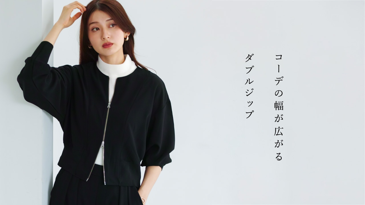 抜け感のあるダブルジップブルゾンは、ふんわりリブで女性らしさをプラス。