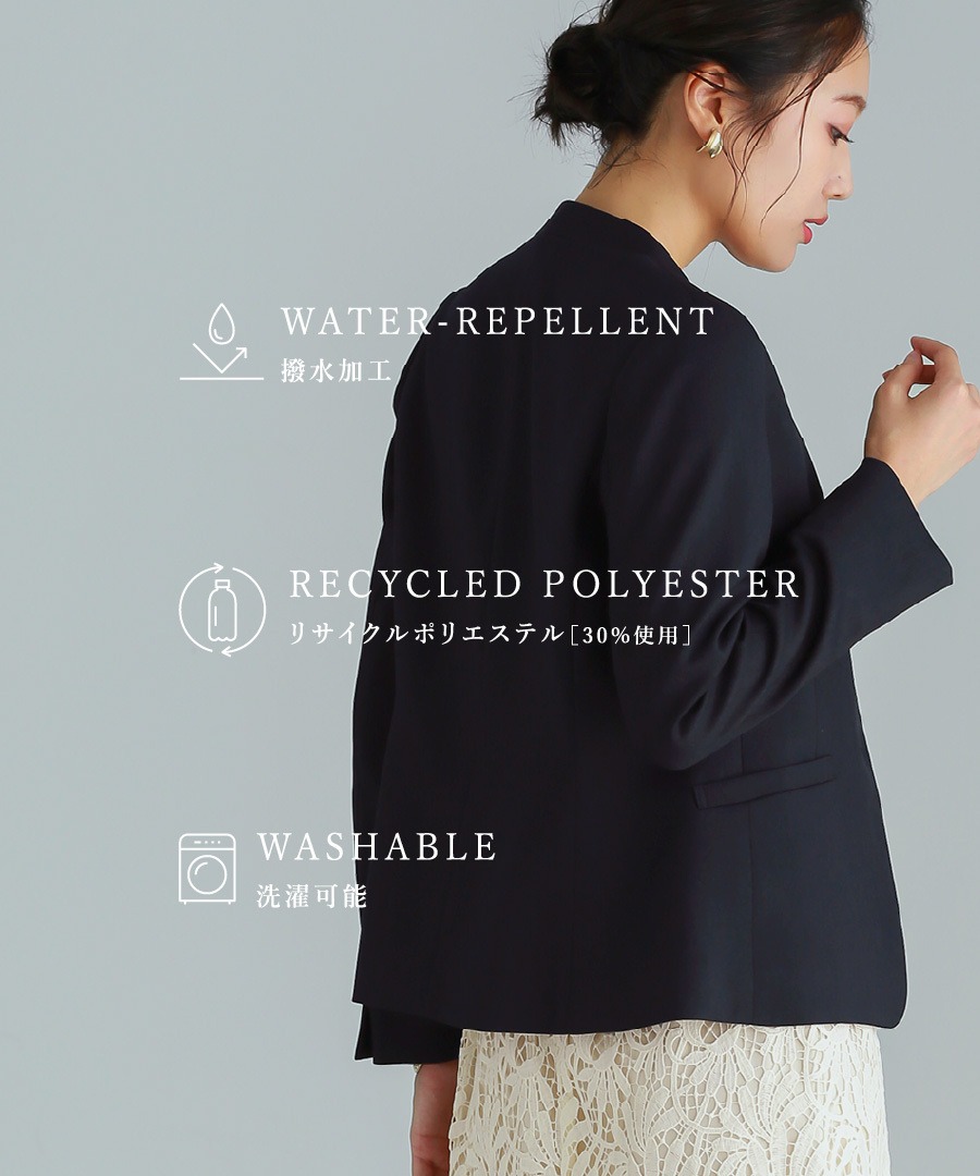 撥水加工 洗濯機可 ウォッシャブル サステナブル リサイクルポリエステル ノーカラージャケット レディース 通勤対応 オフィス きれいめ セットアップ可