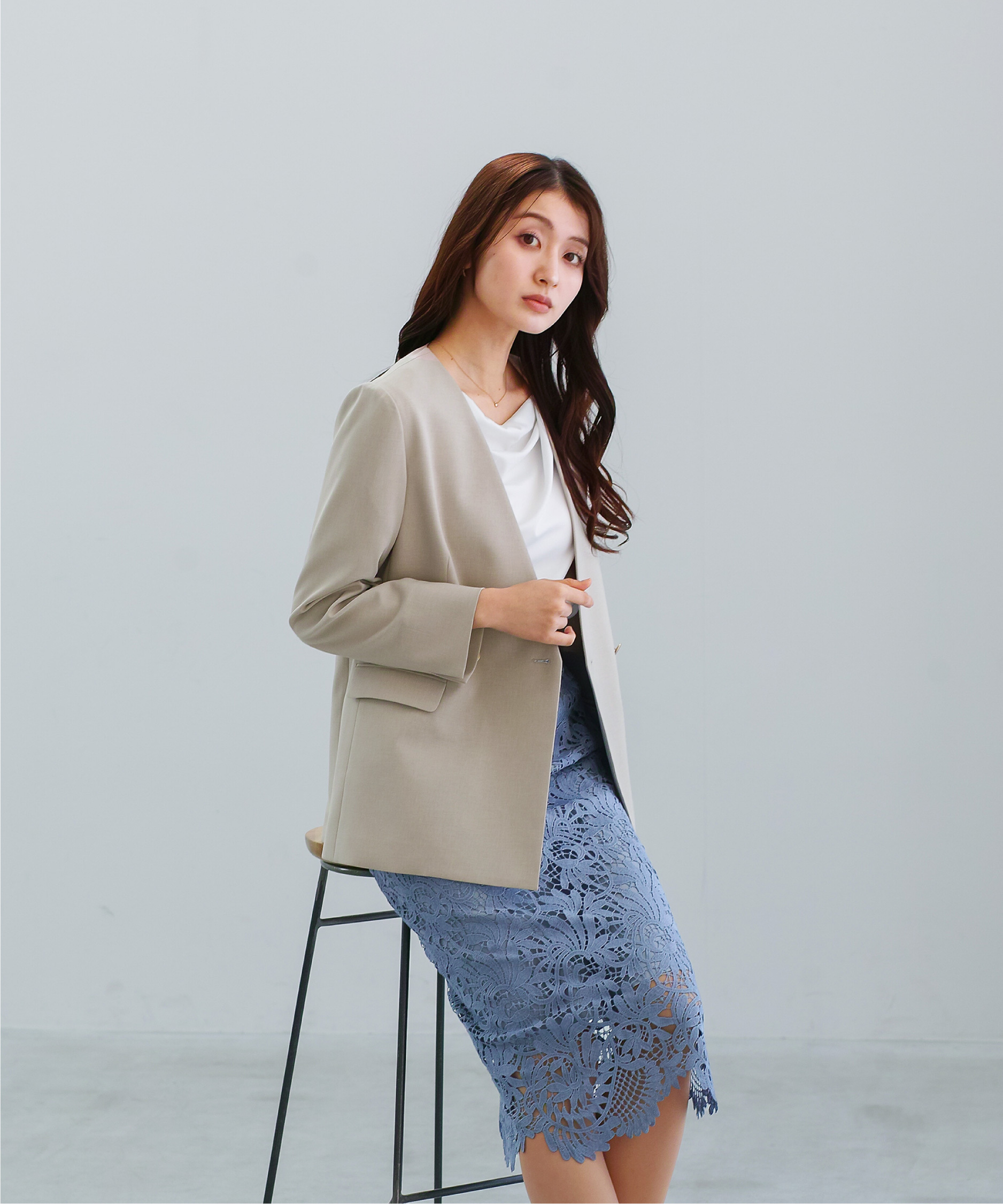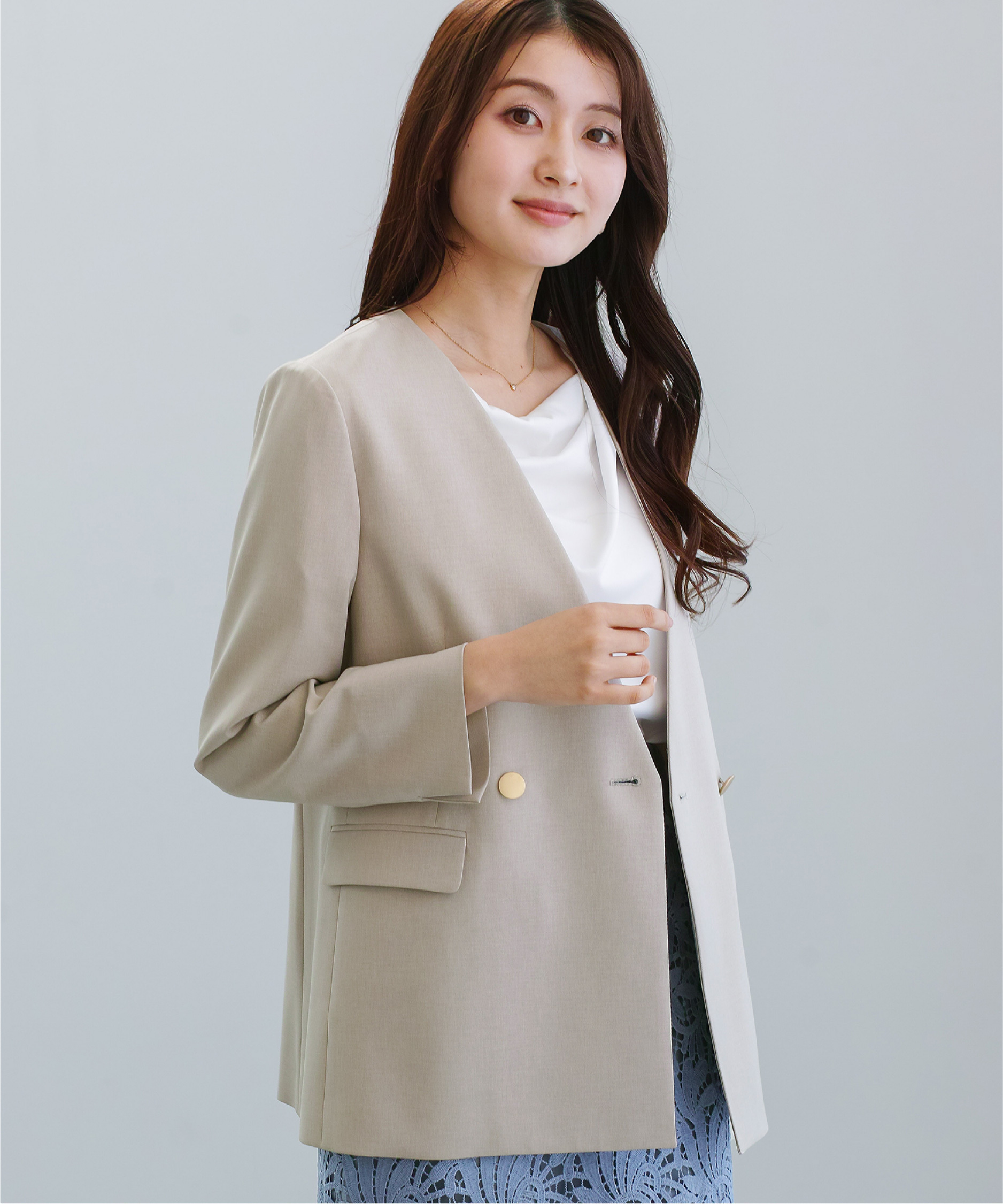 顔まわりをすっきりと見せるノーカラーデザインに