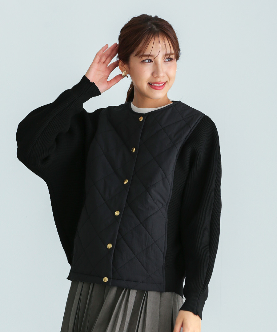 ブルゾン 軽量 異素材ミックス ダイヤキルト リブニット 切り替えデザイン ドルマンスリーブ きれいめ レディース 通勤対応 オフィス デイリー