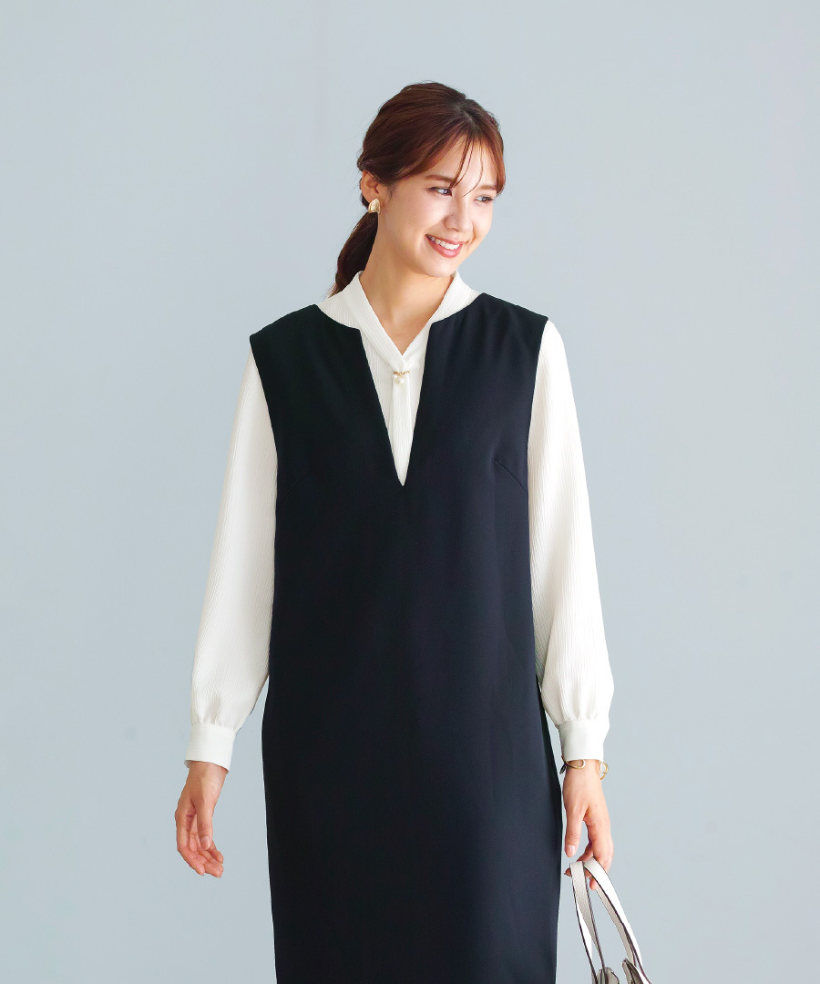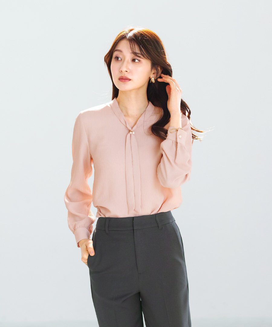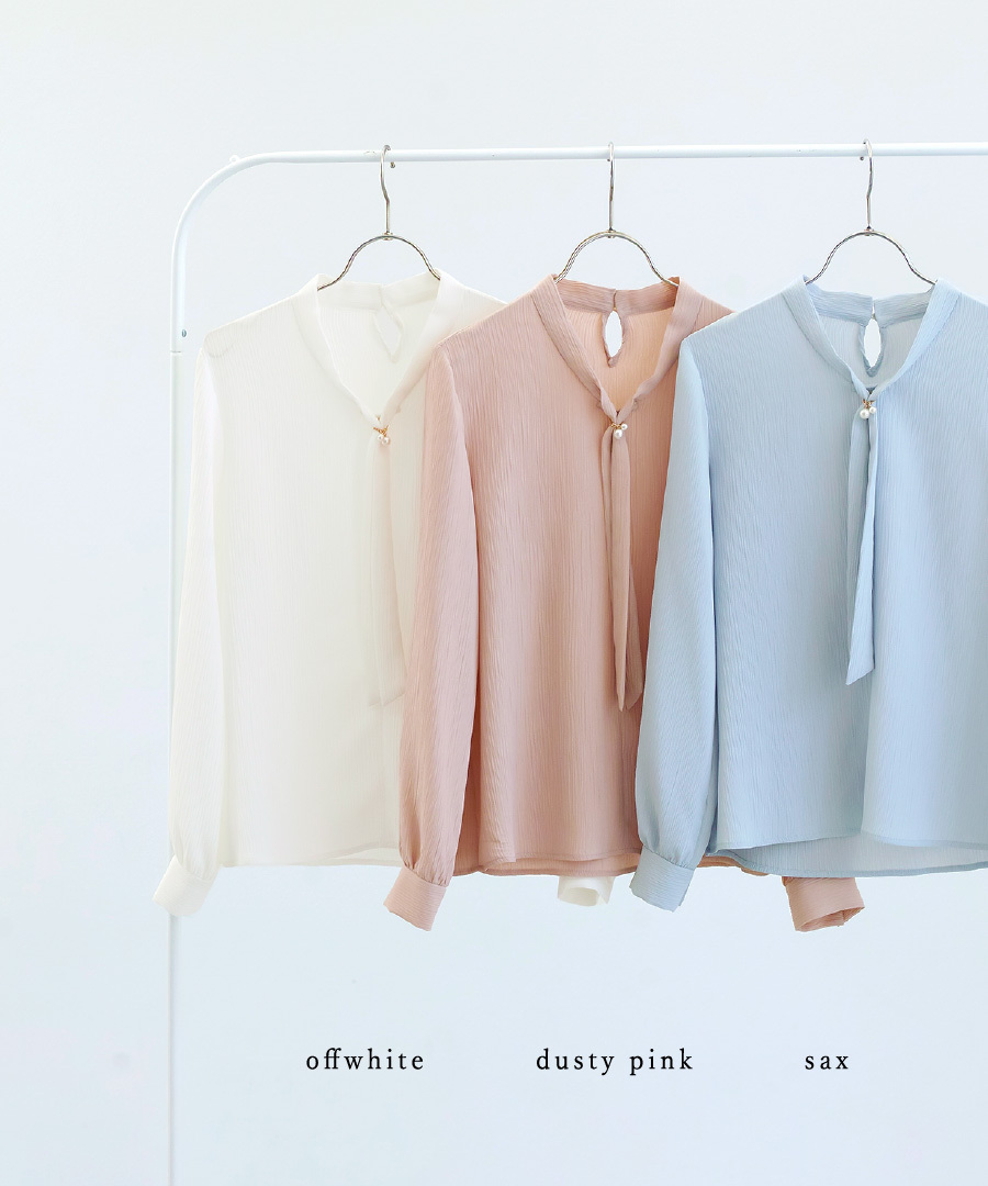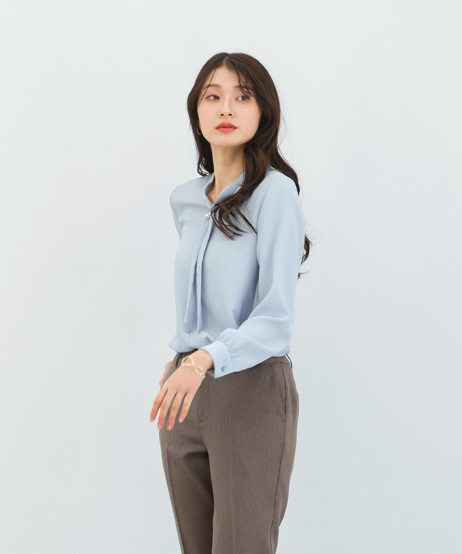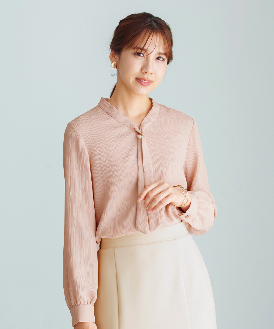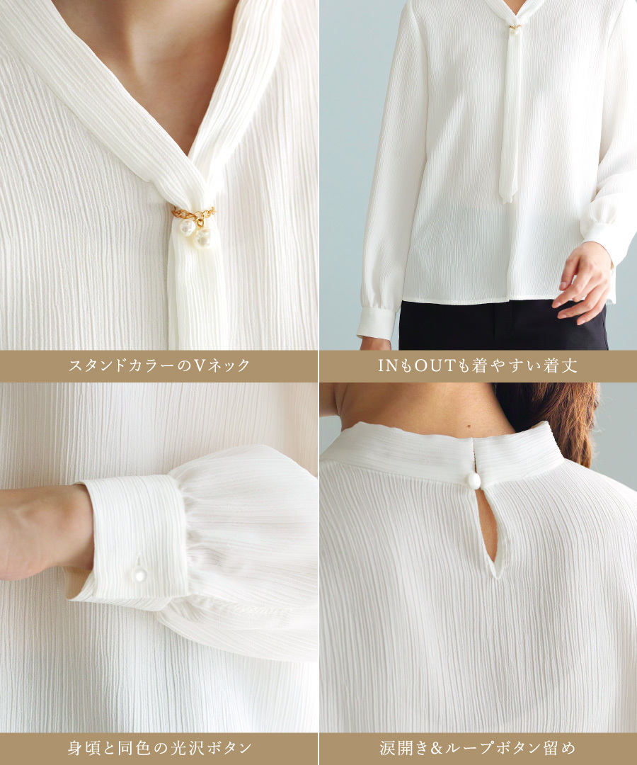 ボウタイデザイン ワンポイント パール アクセサリー付き Vネック スタンドカラー フェミニン エレガント きれいめ レディース 通勤対応 オフィス セレモニー デイリー