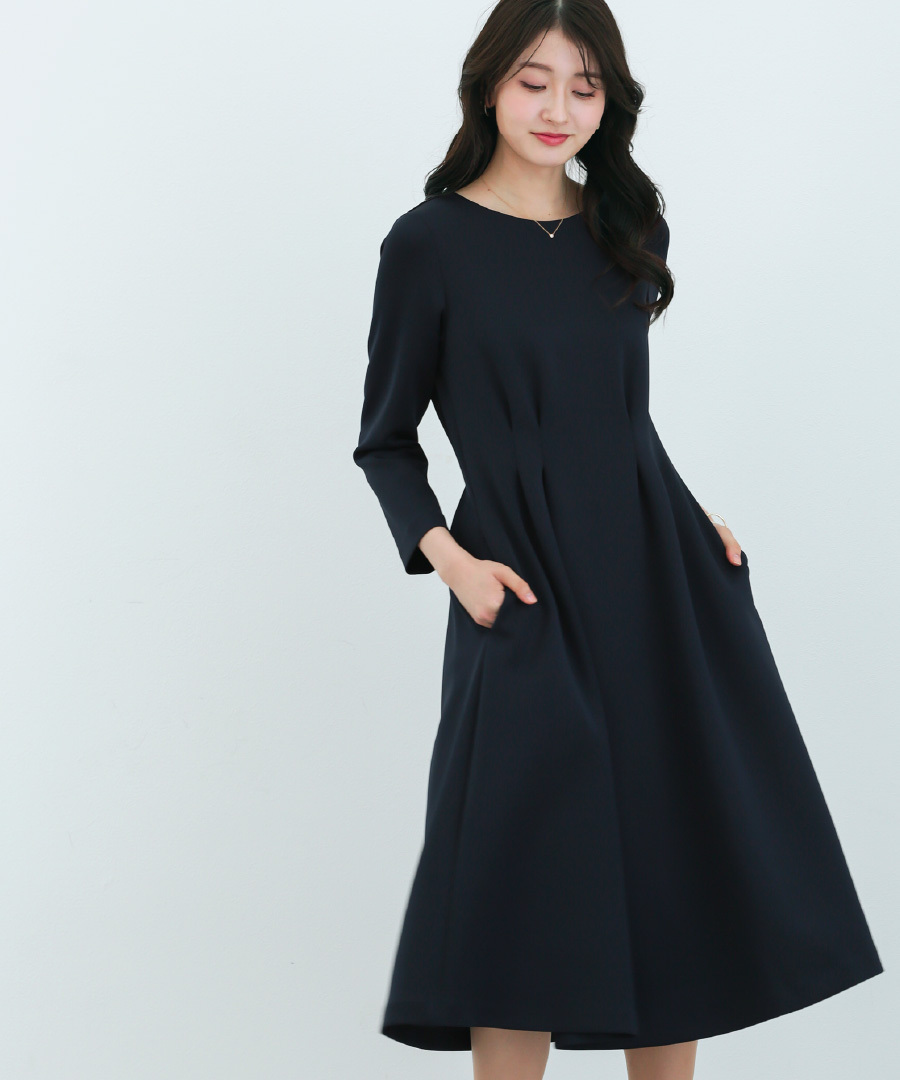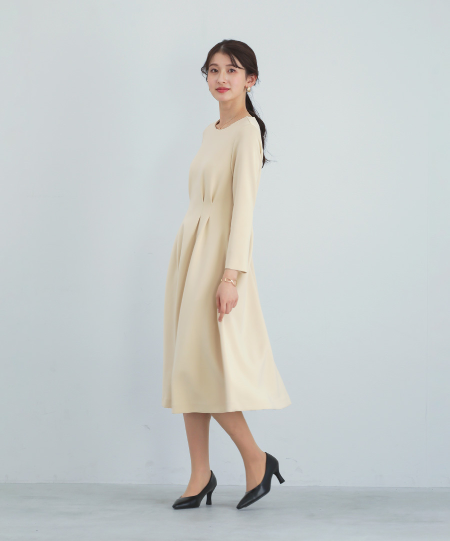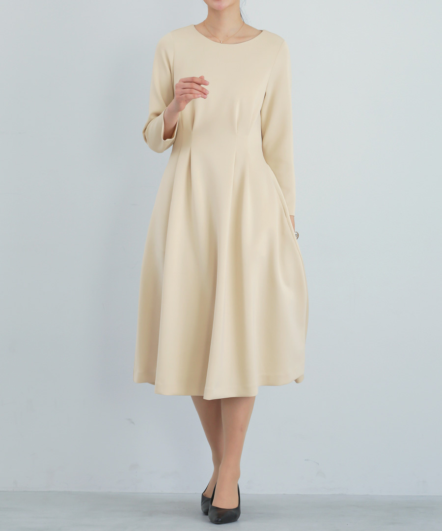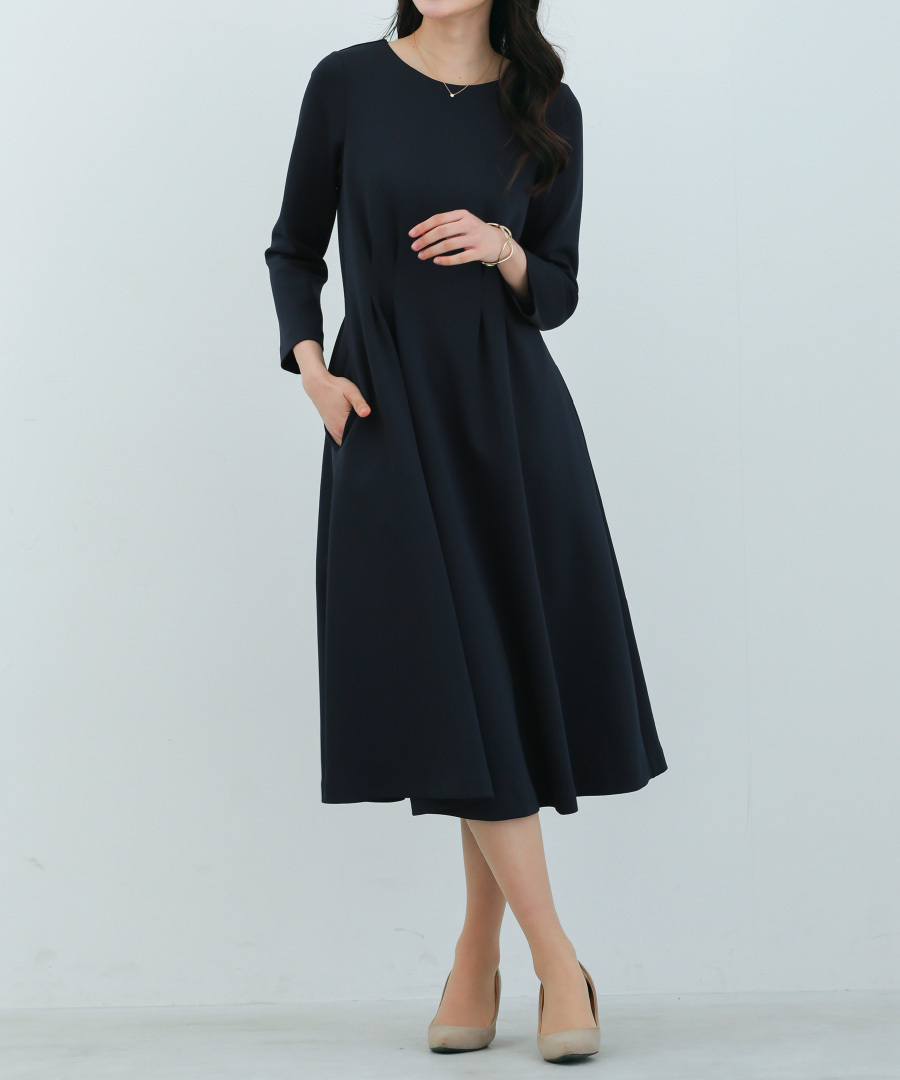 【 洗える・ストレッチ 】 スムースダンボール・タックフレアワンピース