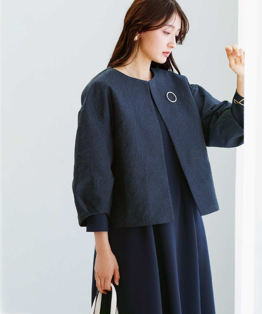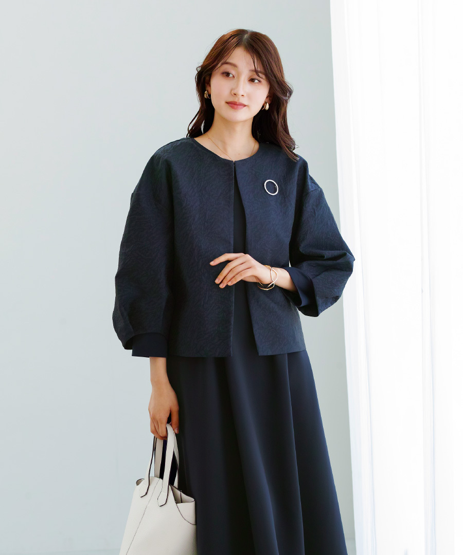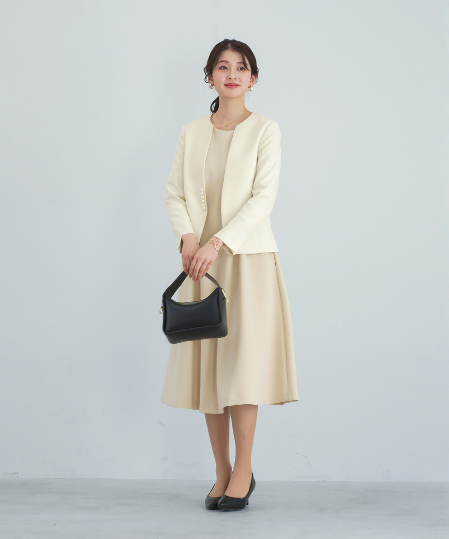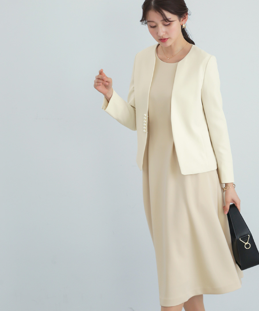 タックフレア ワンピース ストレッチスムースダンボール ラウンドネック 8分袖 ポケット付き レディース オフィス フォーマル セレモニー 入卒式 通勤対応 デイリー 上品 きれいめ ジャケット合わせ