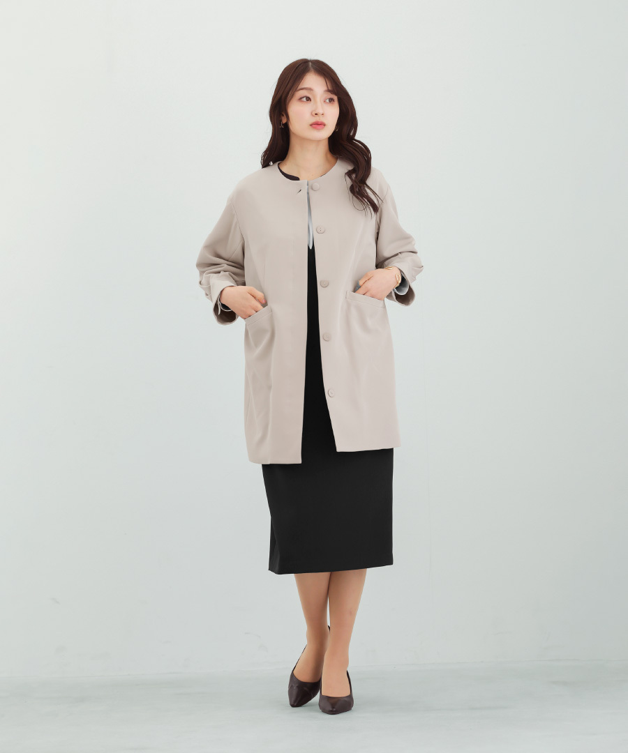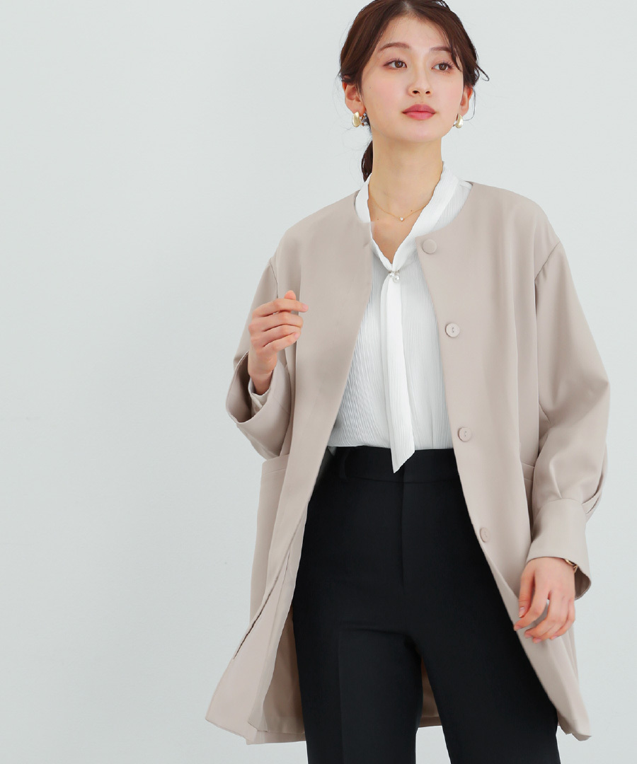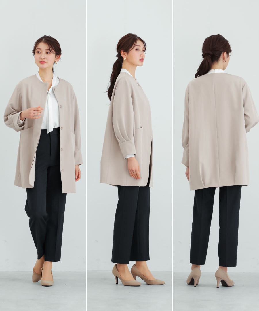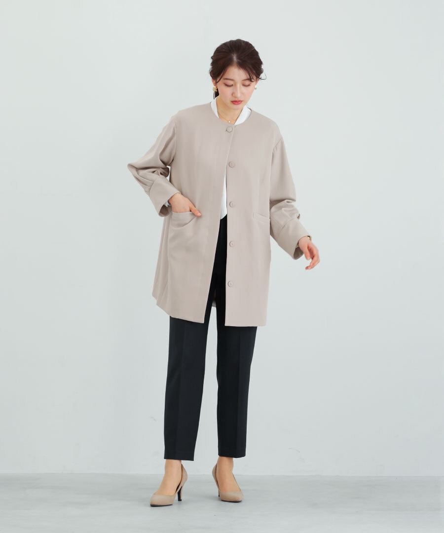 パンツにもワンピースにも合わせやすい万能アウターです。