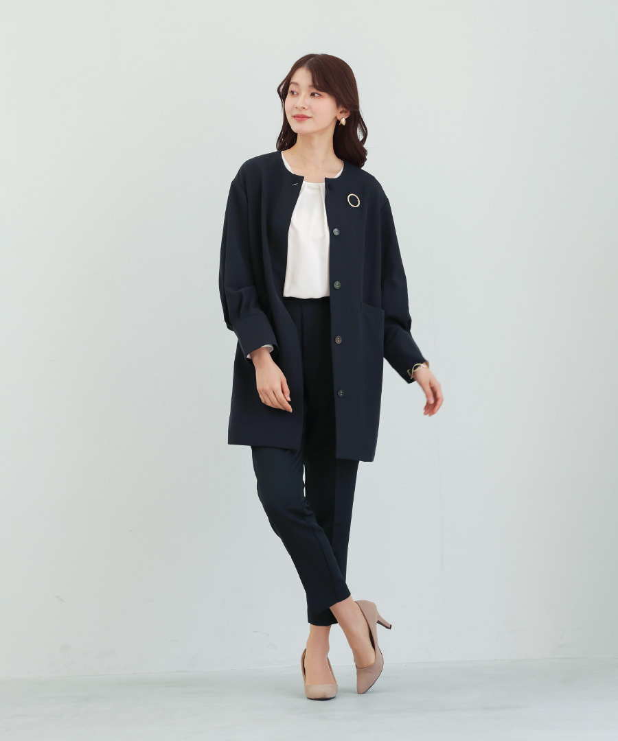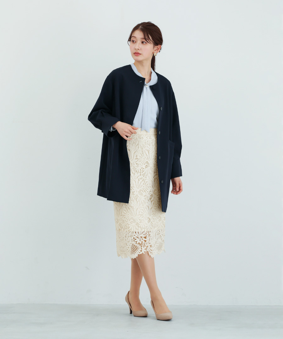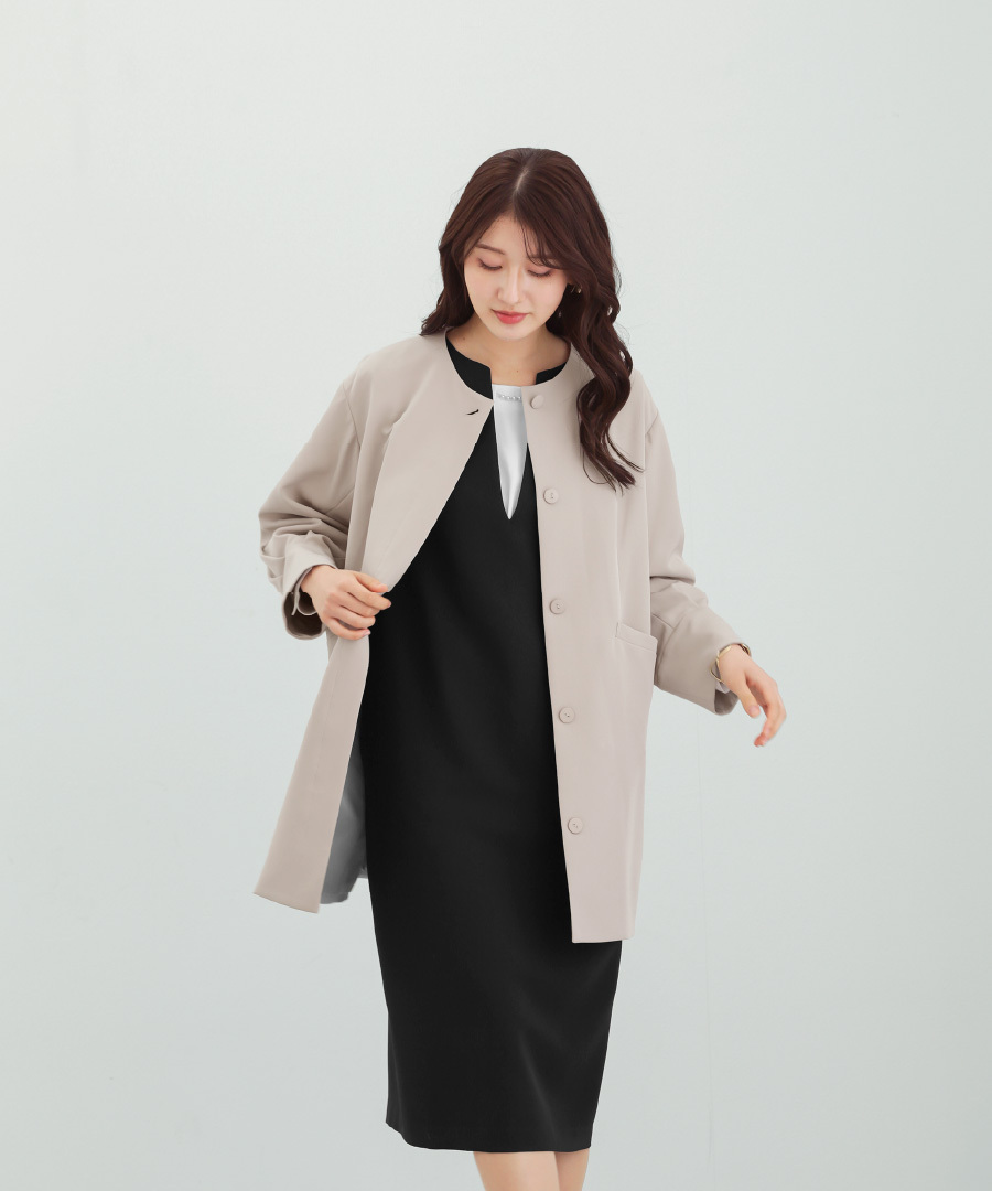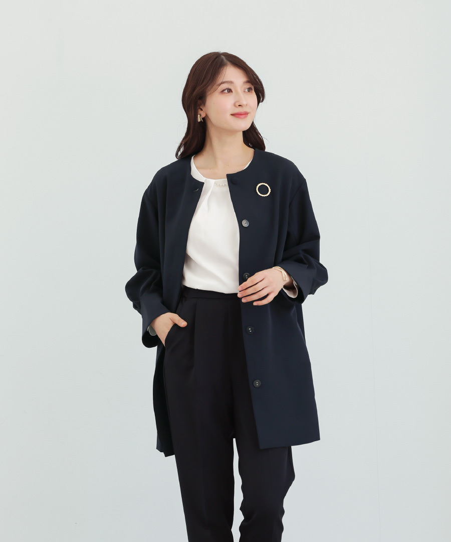 パンツにもワンピースにも合わせやすい万能アウターです。