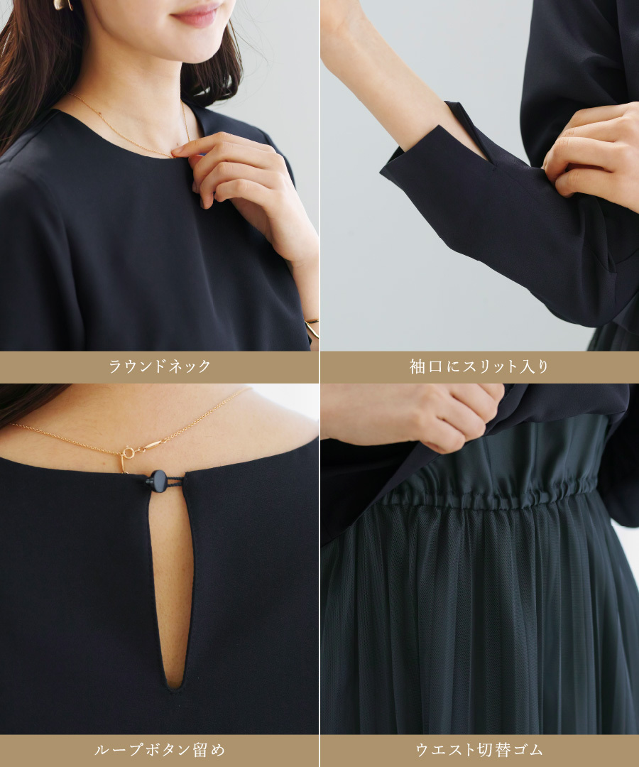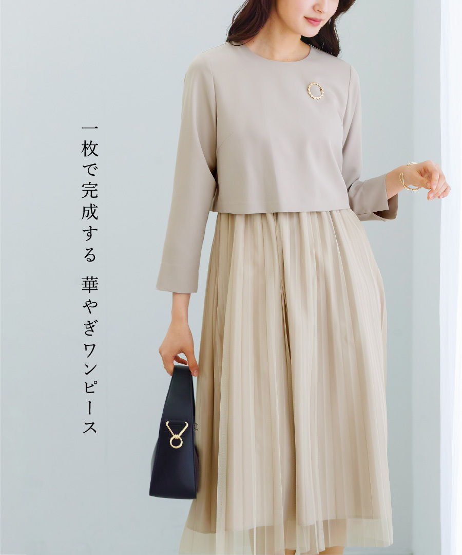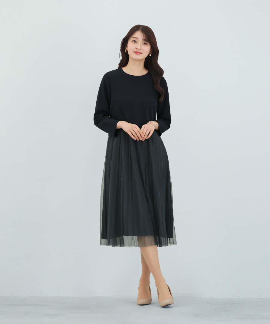 チュールプリーツ レイヤードワンピース ウエスト切り替え アコーディオンプリーツ ダブルピケ UVカット 速乾 接触冷感 防シワ ストレッチ 洗える 多機能 シンプル きれいめ 上品 大人フェミニン 通勤対応 オフィス きちんと デイリー お出かけ 春 夏 秋 レディース
