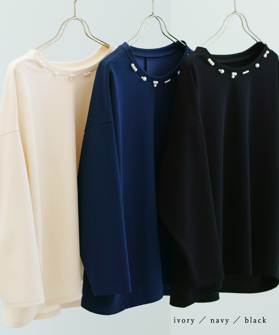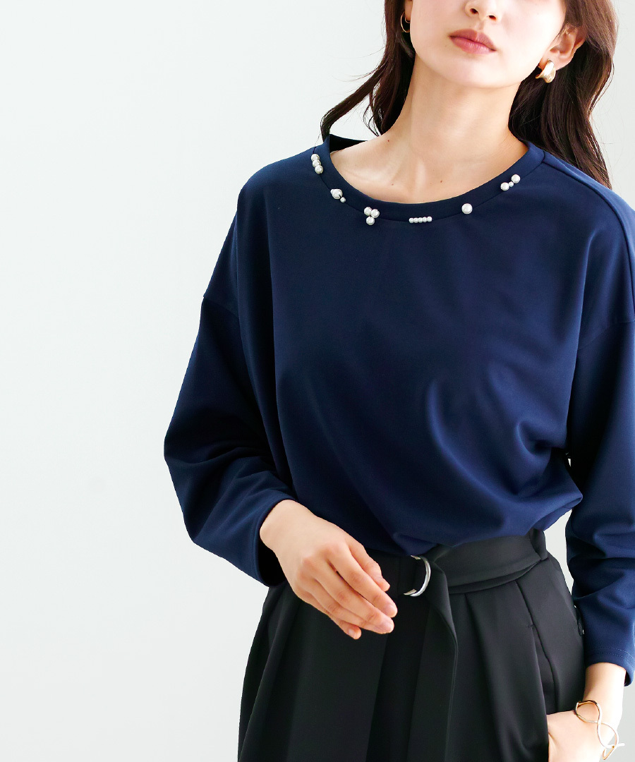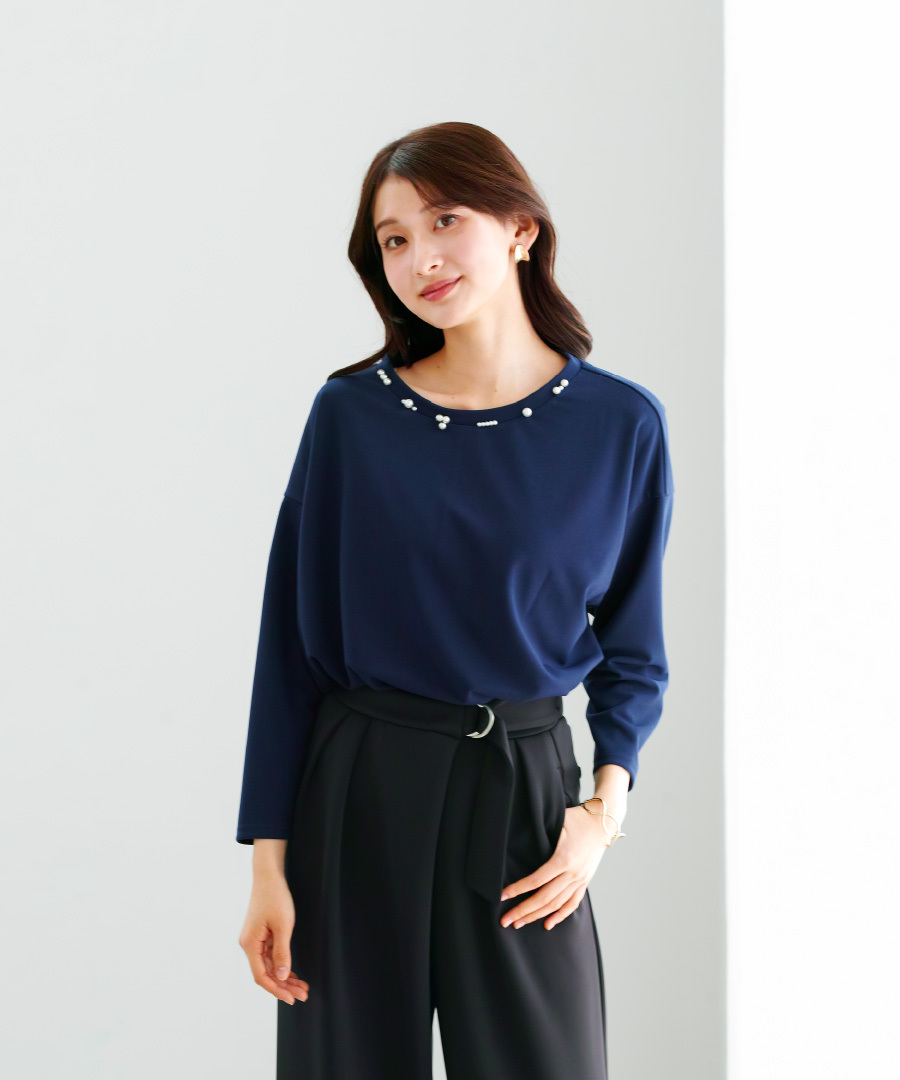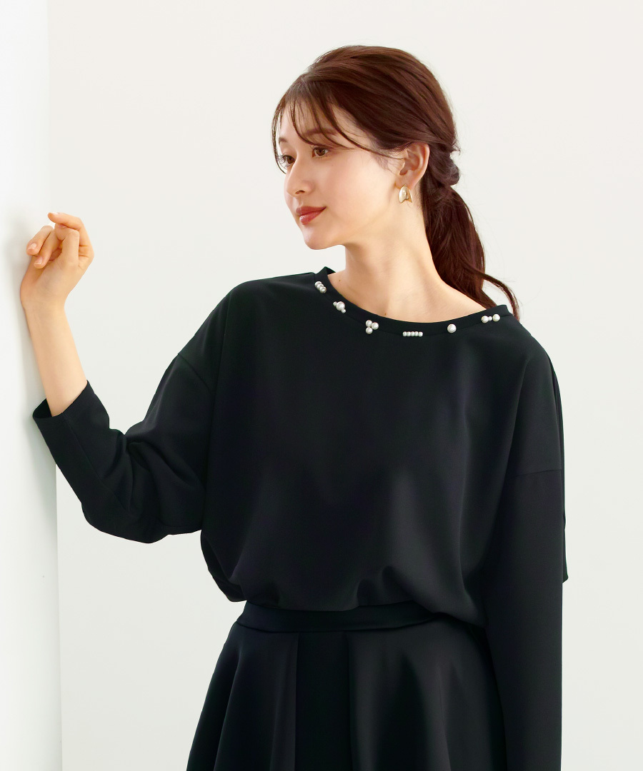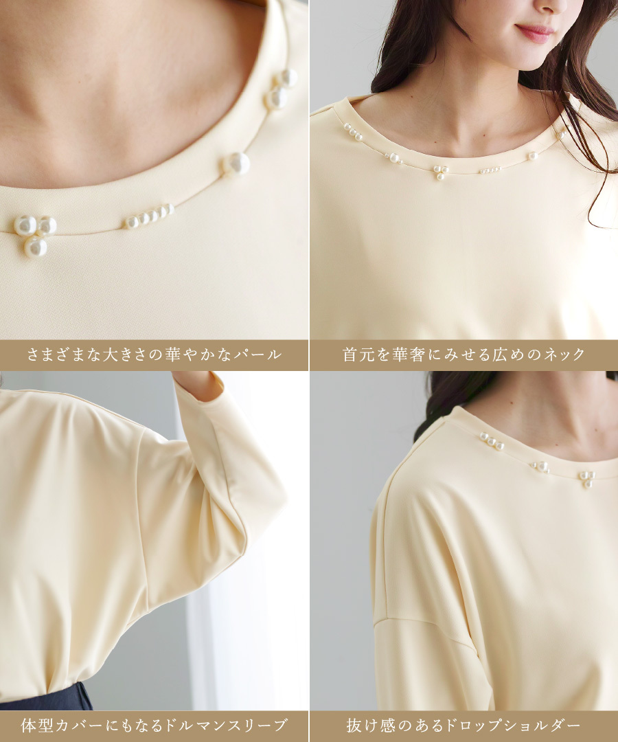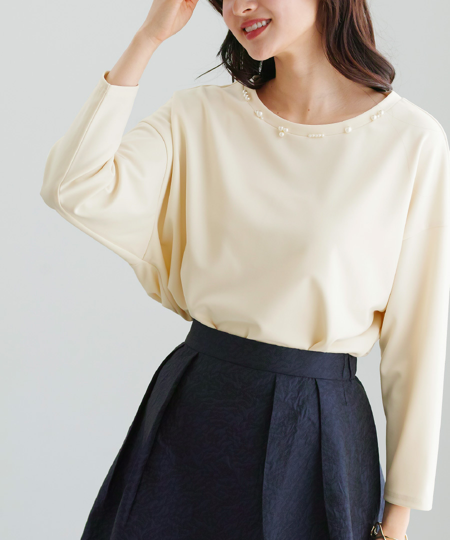 【 ディテール映え 】 ドライタッチフライス・ランダムパールライクドルマンブラウス(776018)