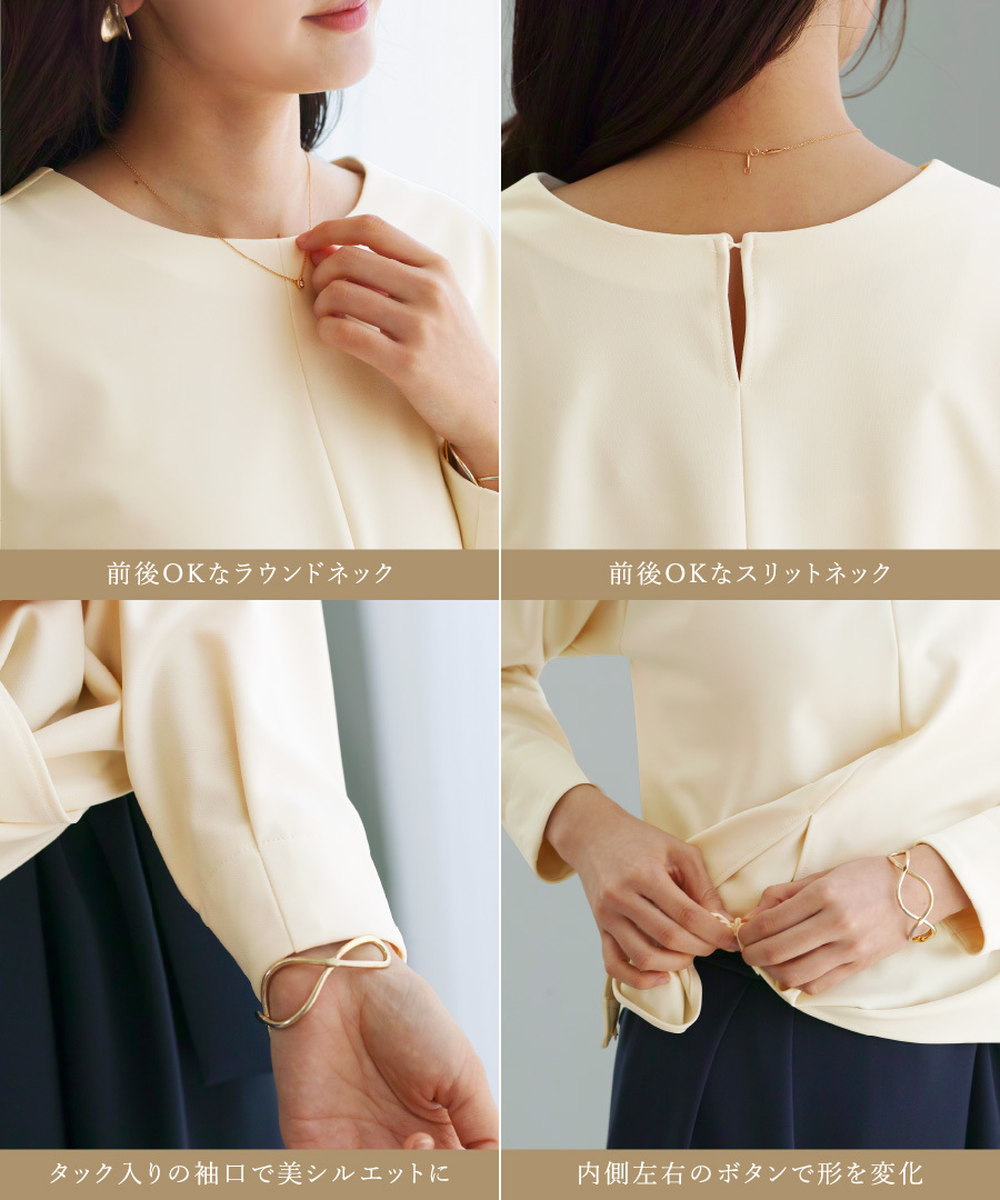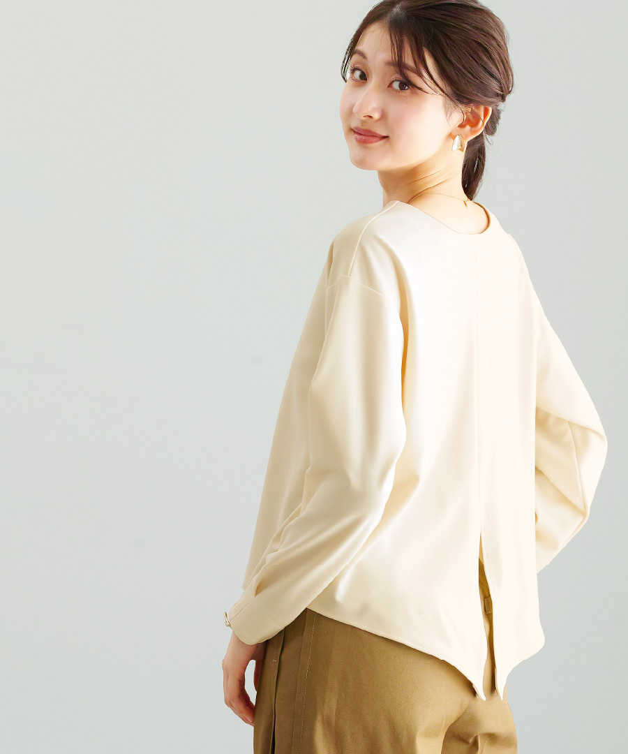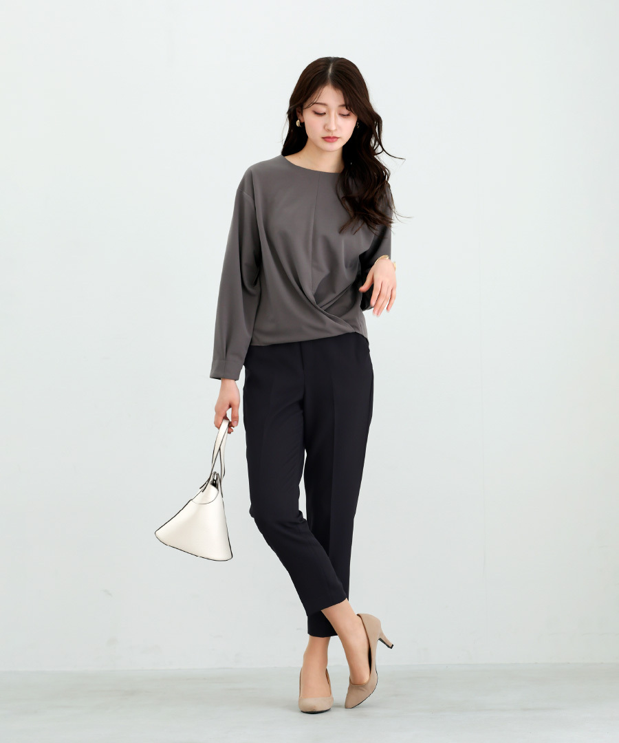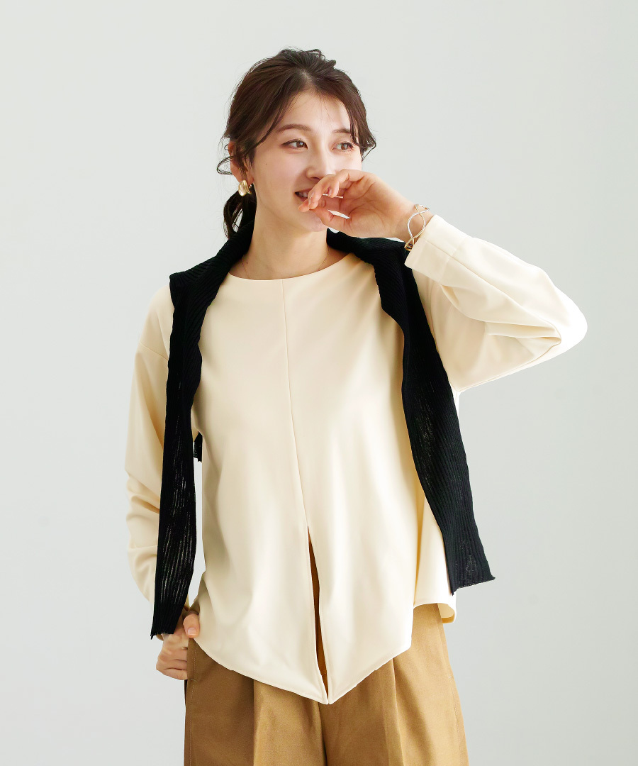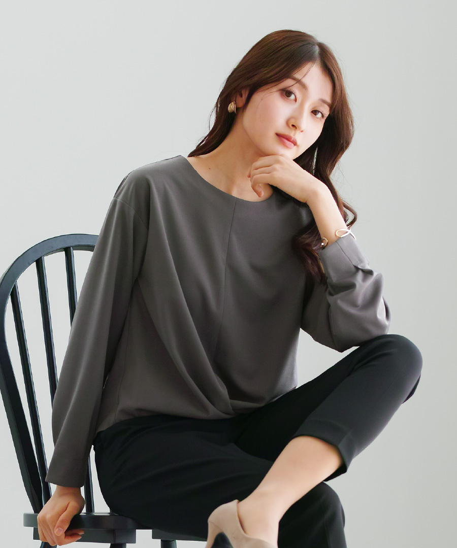 パンツにもスカートにも合わせやすい万能デザインブラウスです。