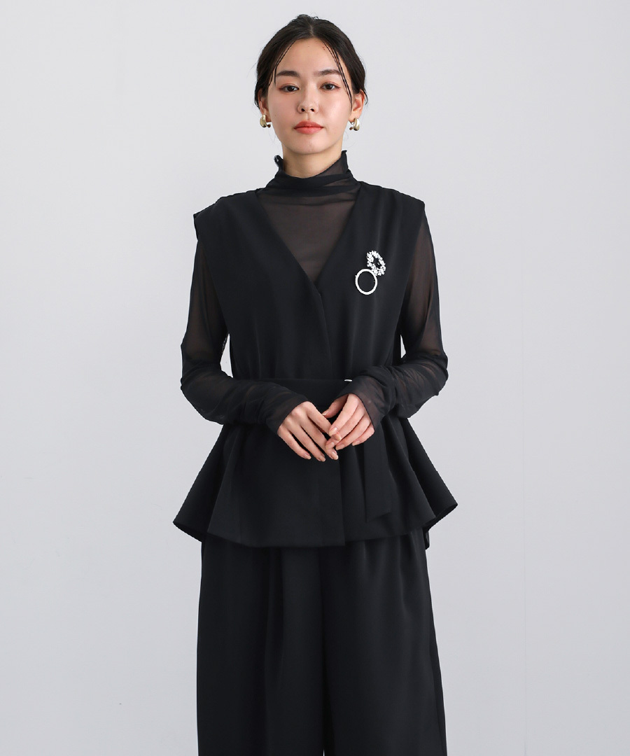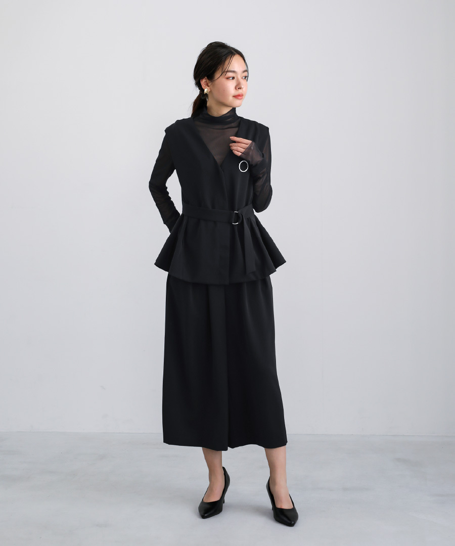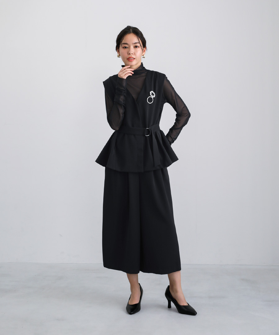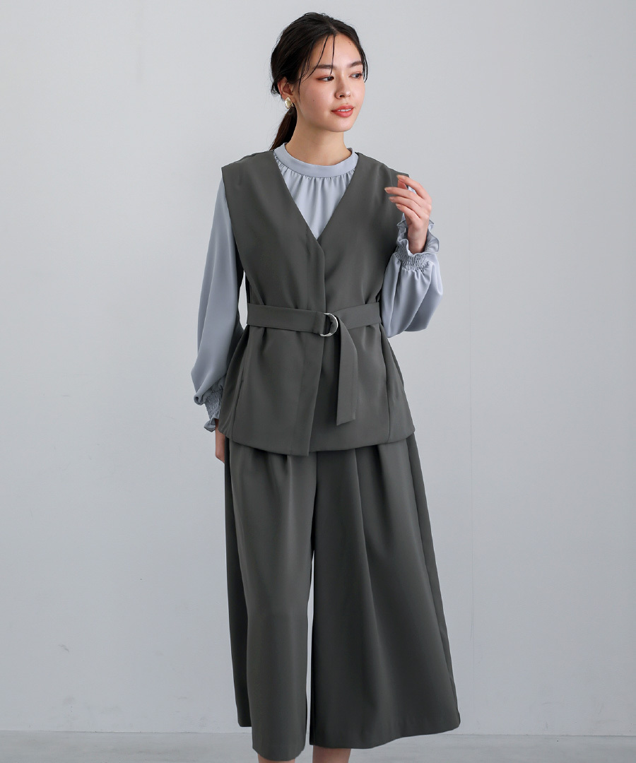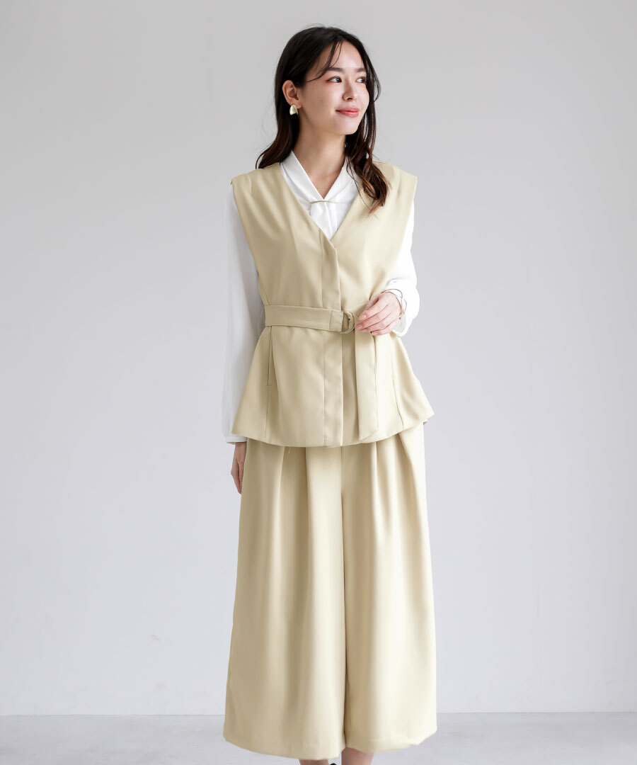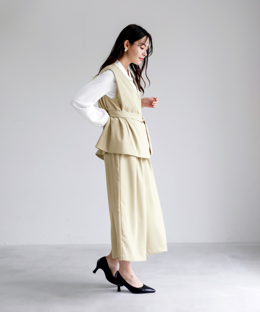同素材のジレとのセットアップスタイルもおすすめです。
