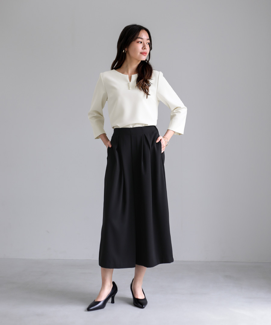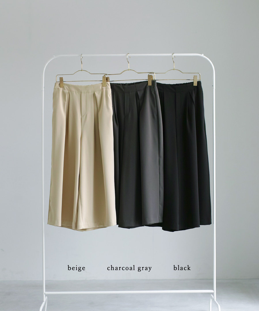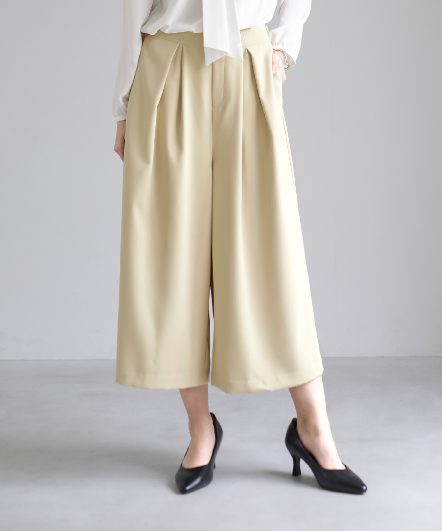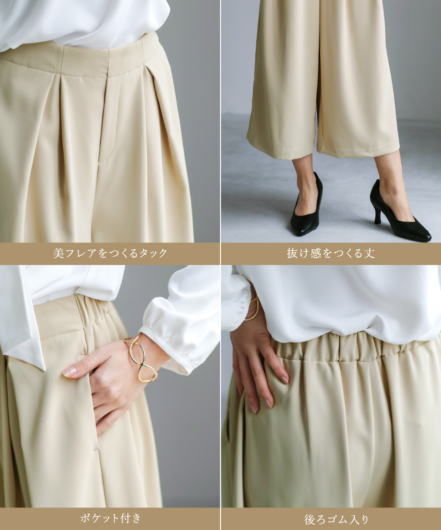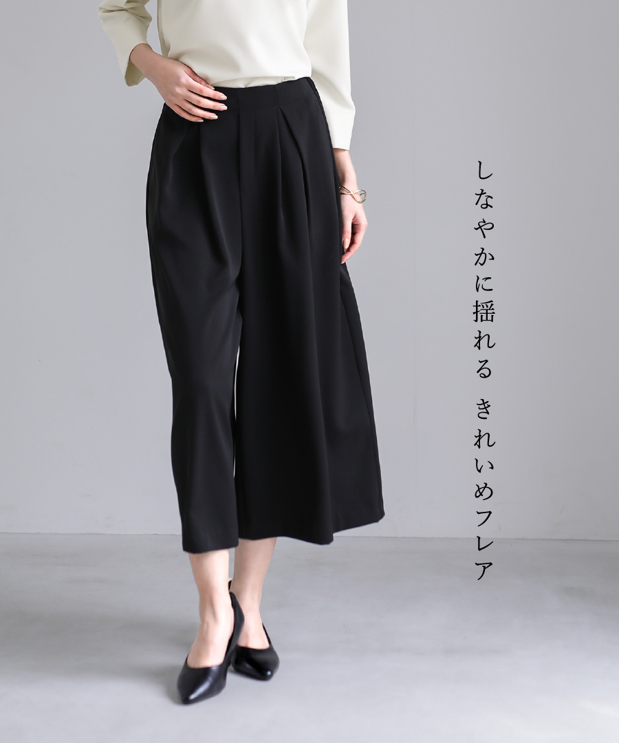 フレアパンツ とろみ素材 きれいめパンツ セレモニー対応 後ろゴム タックパンツ ミディ丈 オフィススタイル セットアップ スカート見え