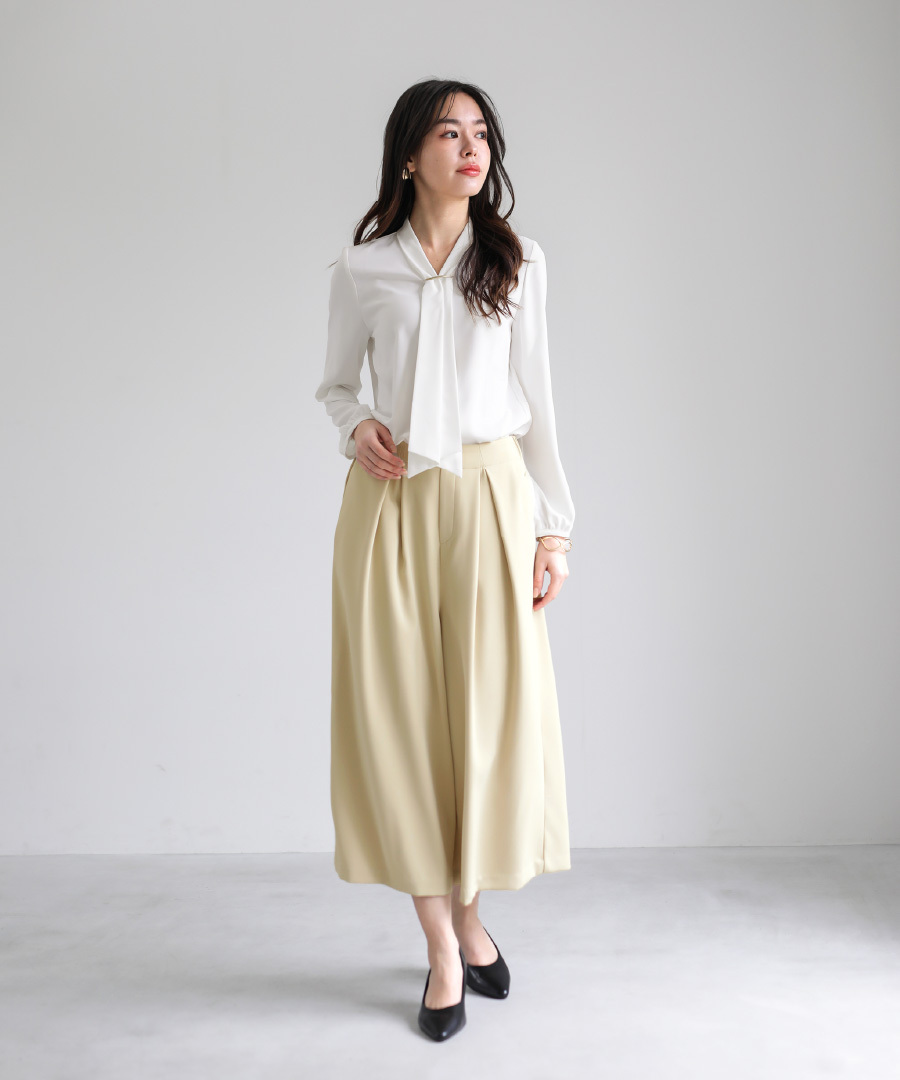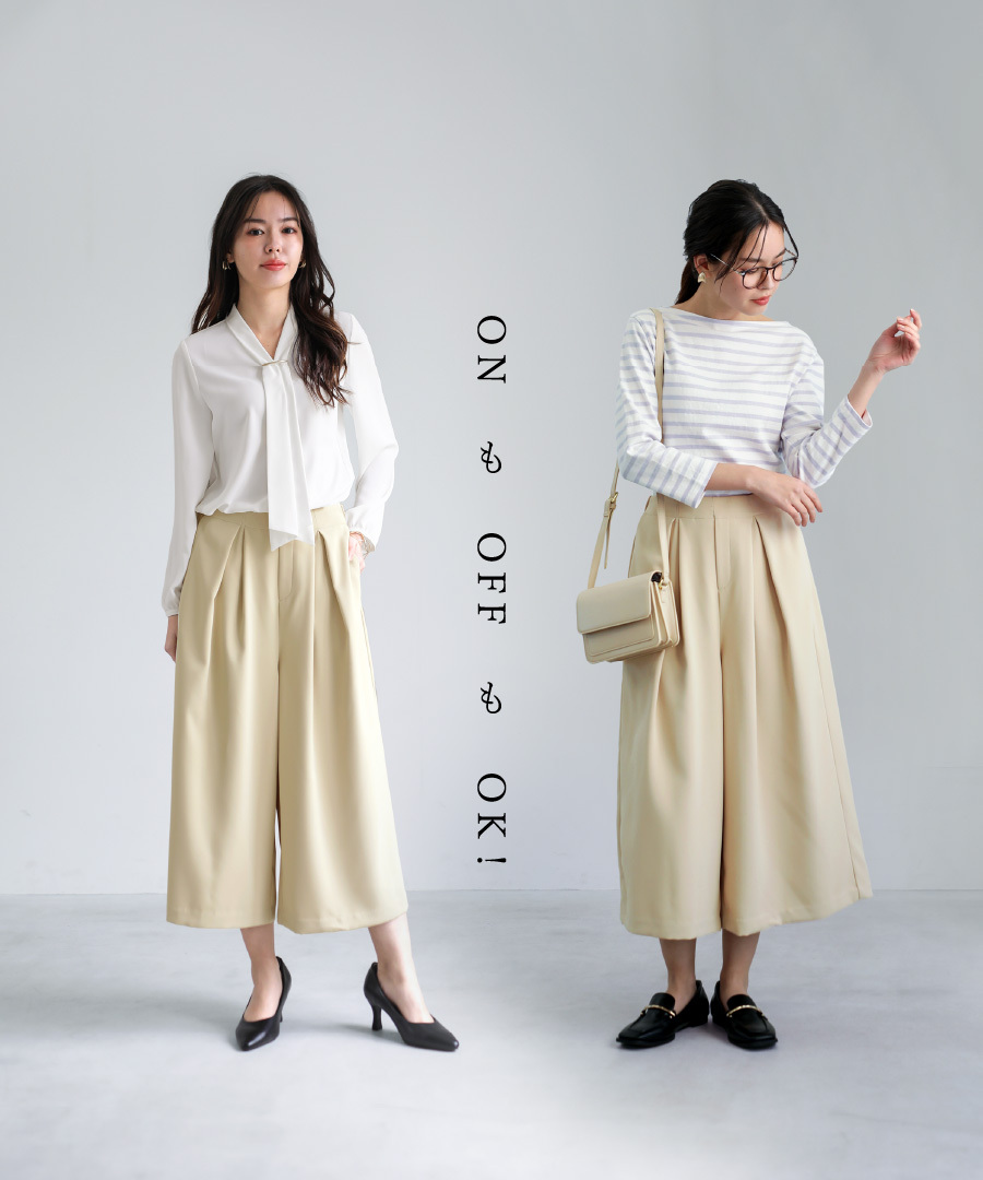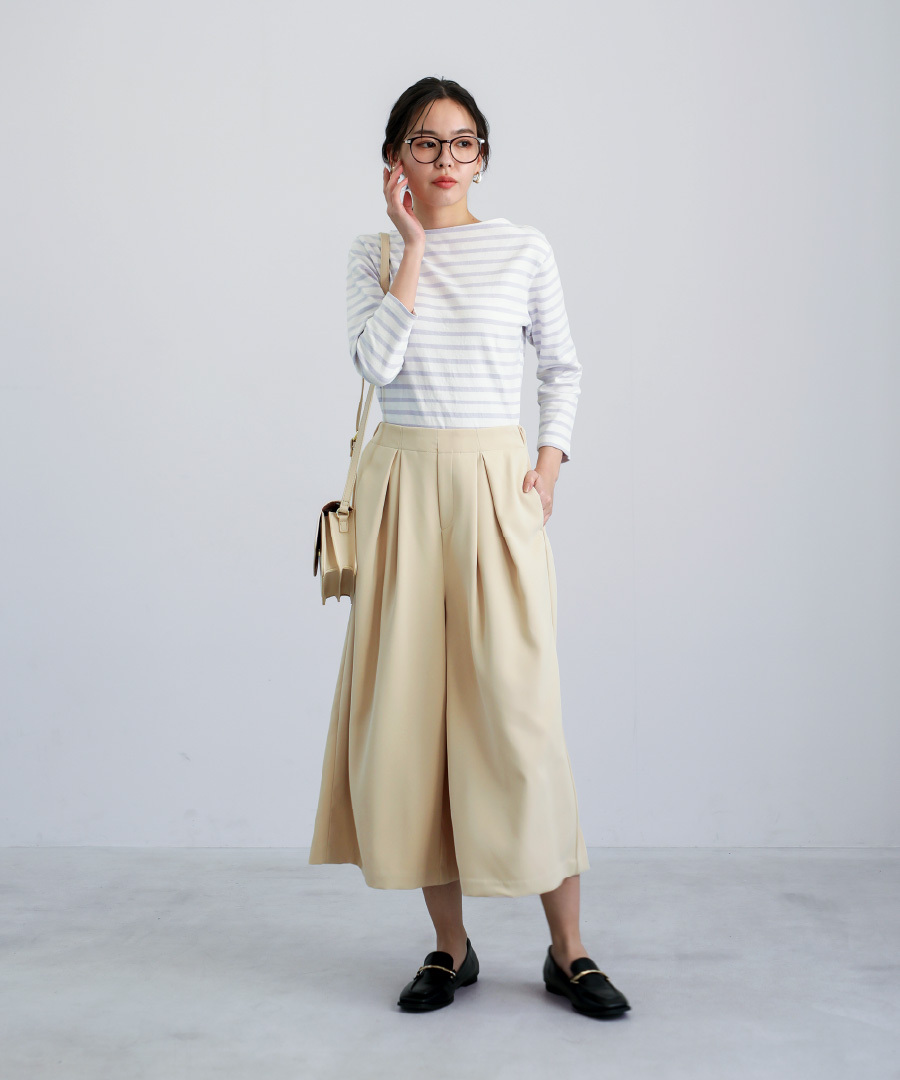 タック入りのデザインが腰まわりをすっきり見せ