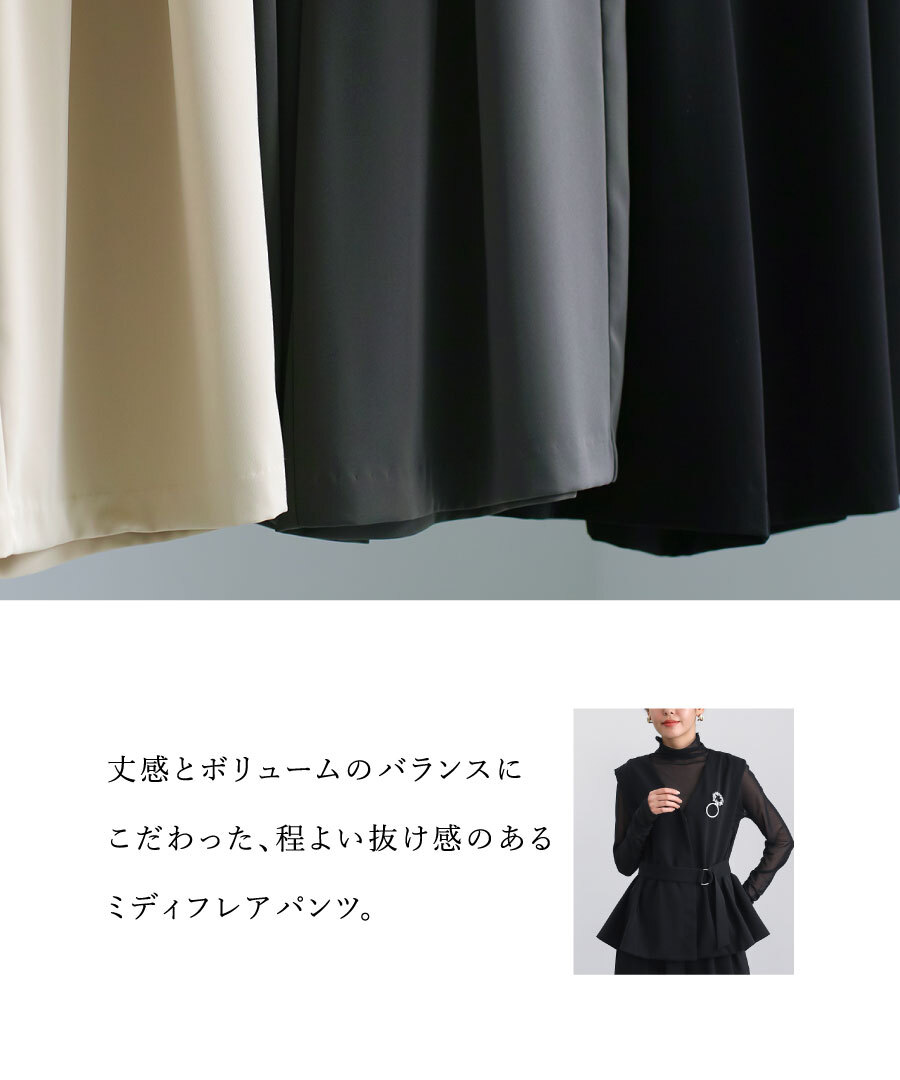 やわらかな落ち感が魅力のミディフレアパンツ。