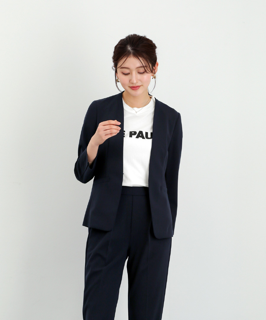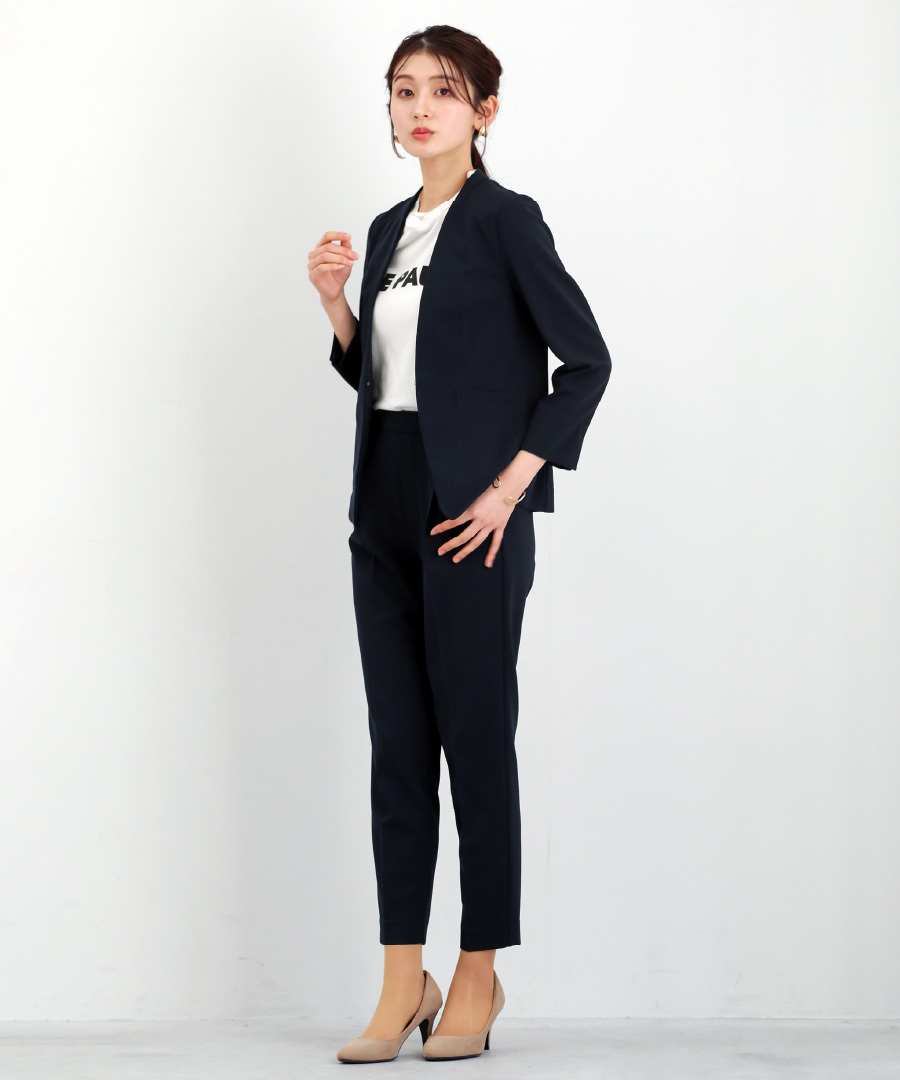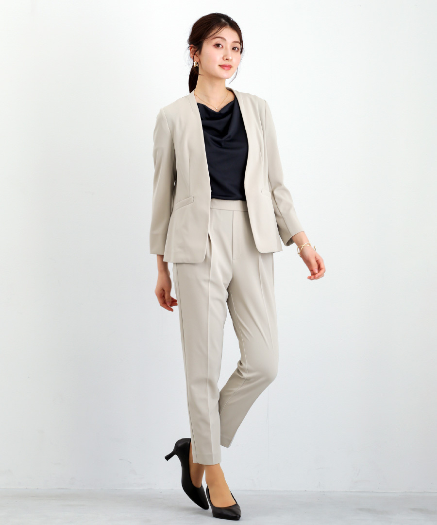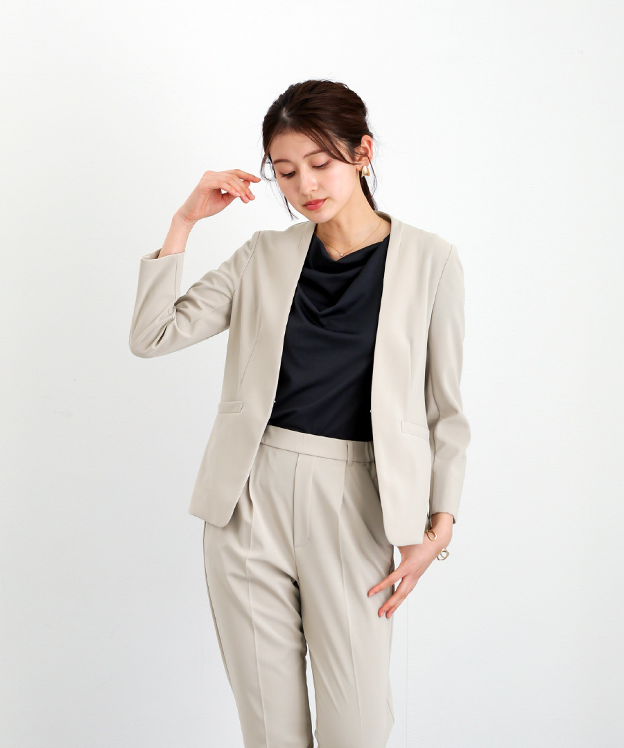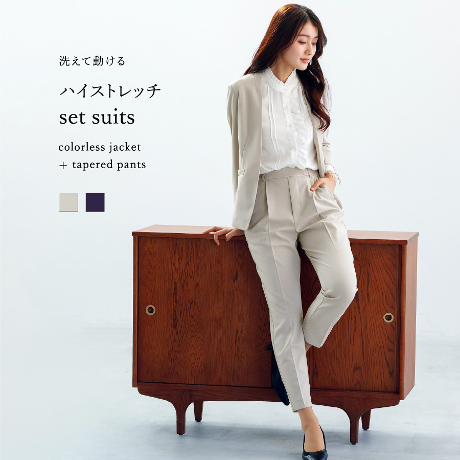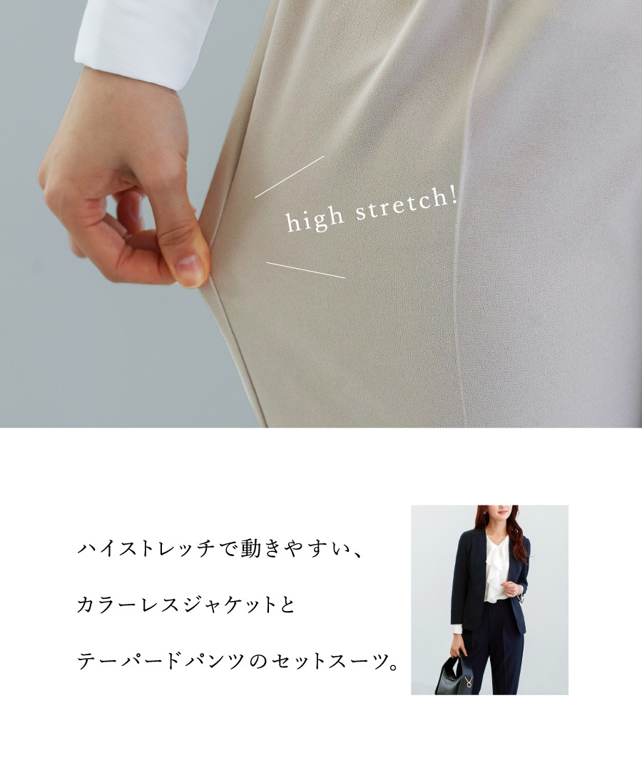 セットスーツ パンツスーツ ハイストレッチ 洗えるスーツ カラーレスジャケット テーパードパンツ オフィスコーデ セレモニースーツ きれいめ 通勤服