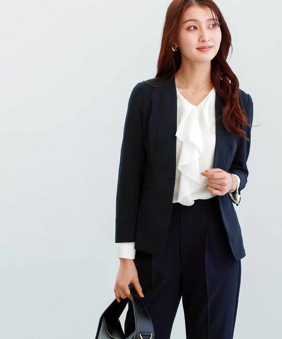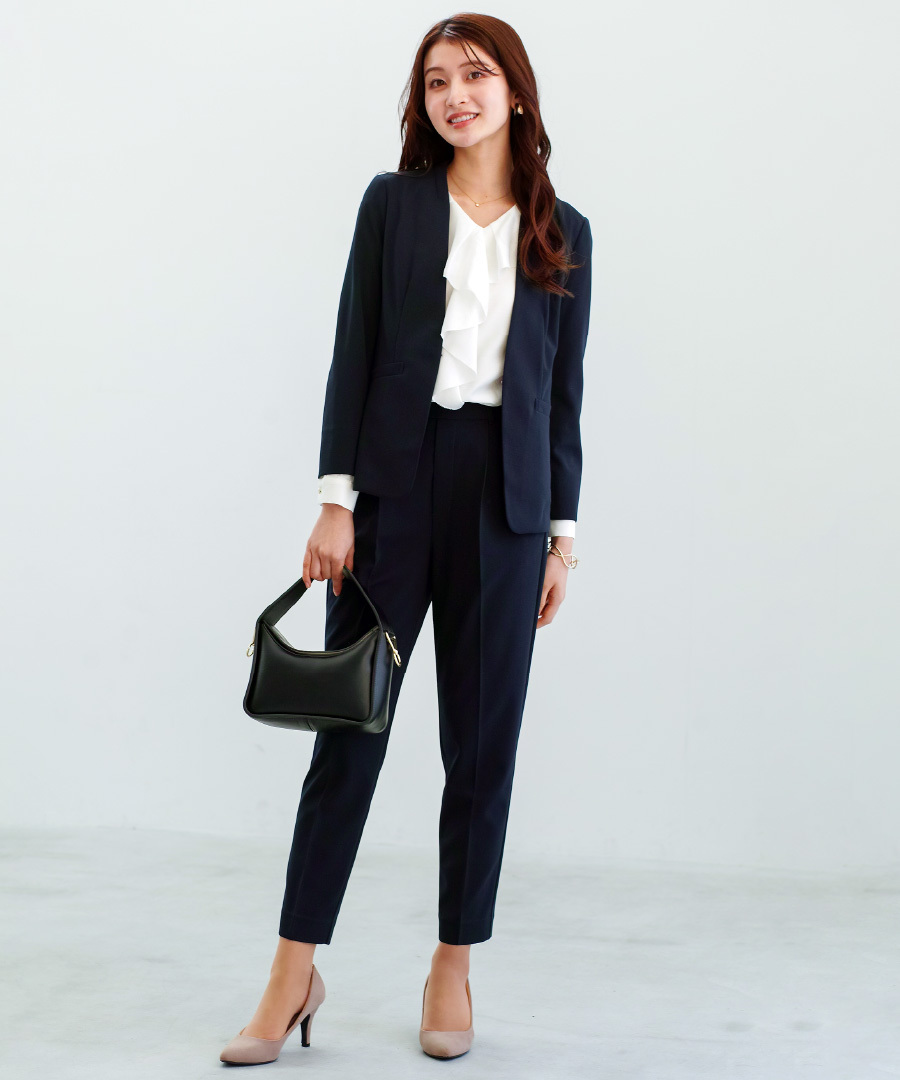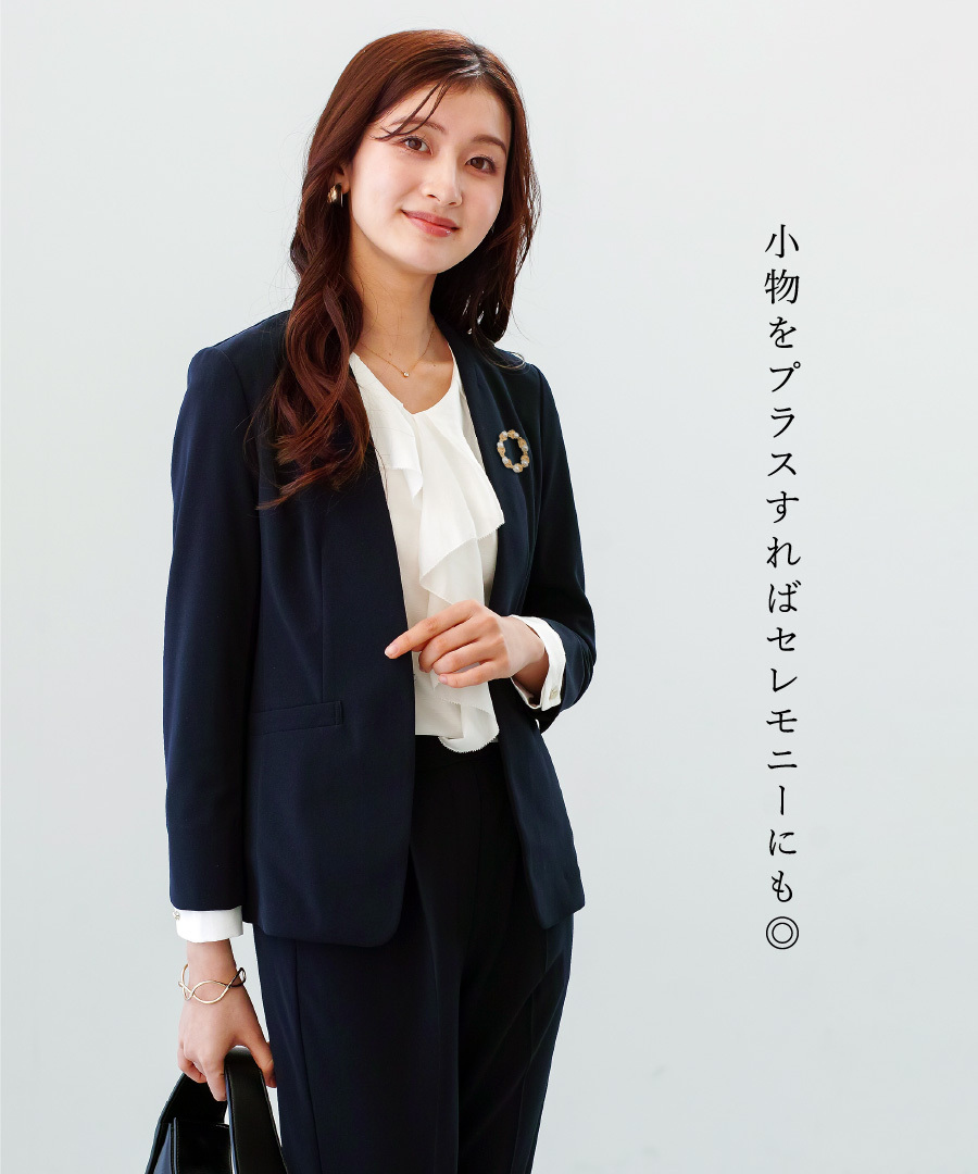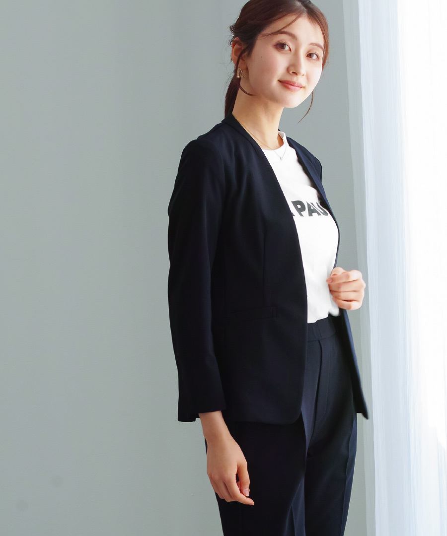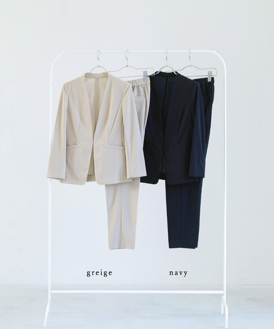セットスーツ パンツスーツ ハイストレッチ 洗えるスーツ カラーレスジャケット テーパードパンツ オフィスコーデ セレモニースーツ きれいめ 通勤服