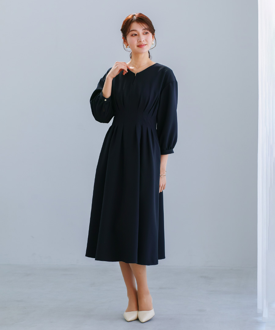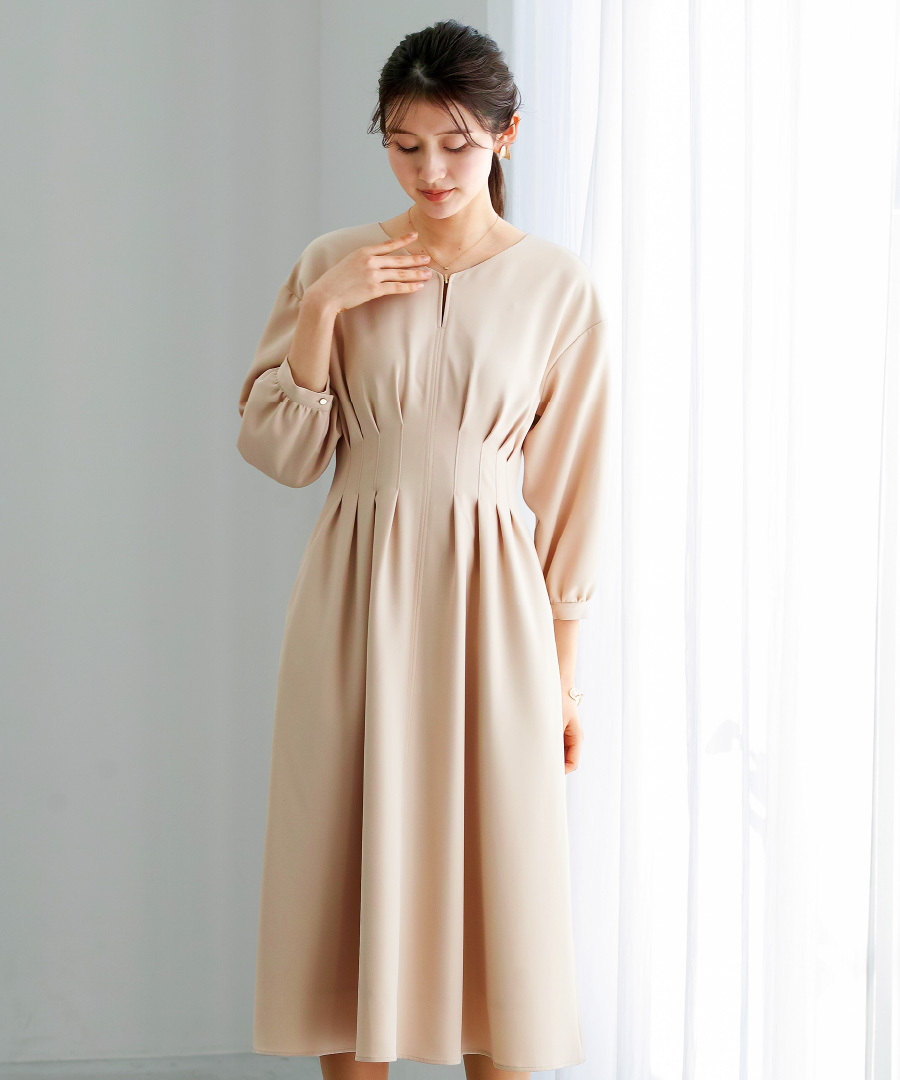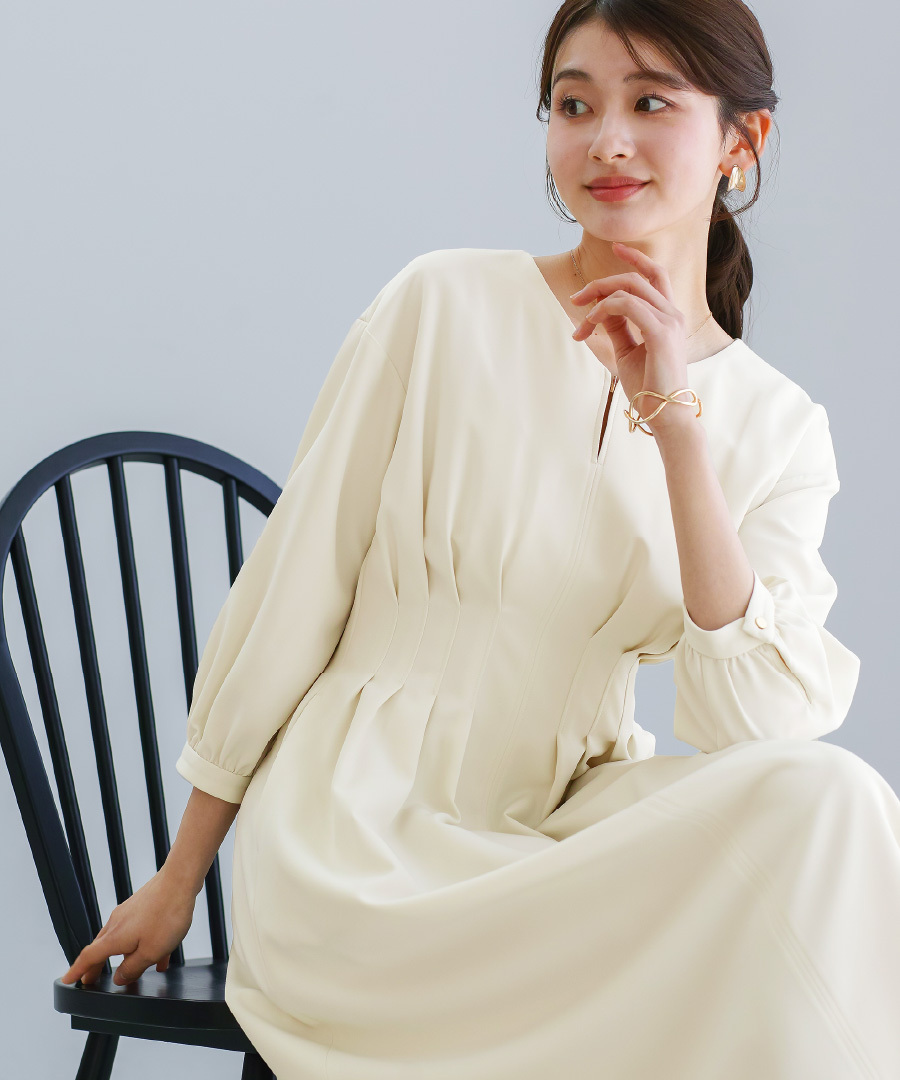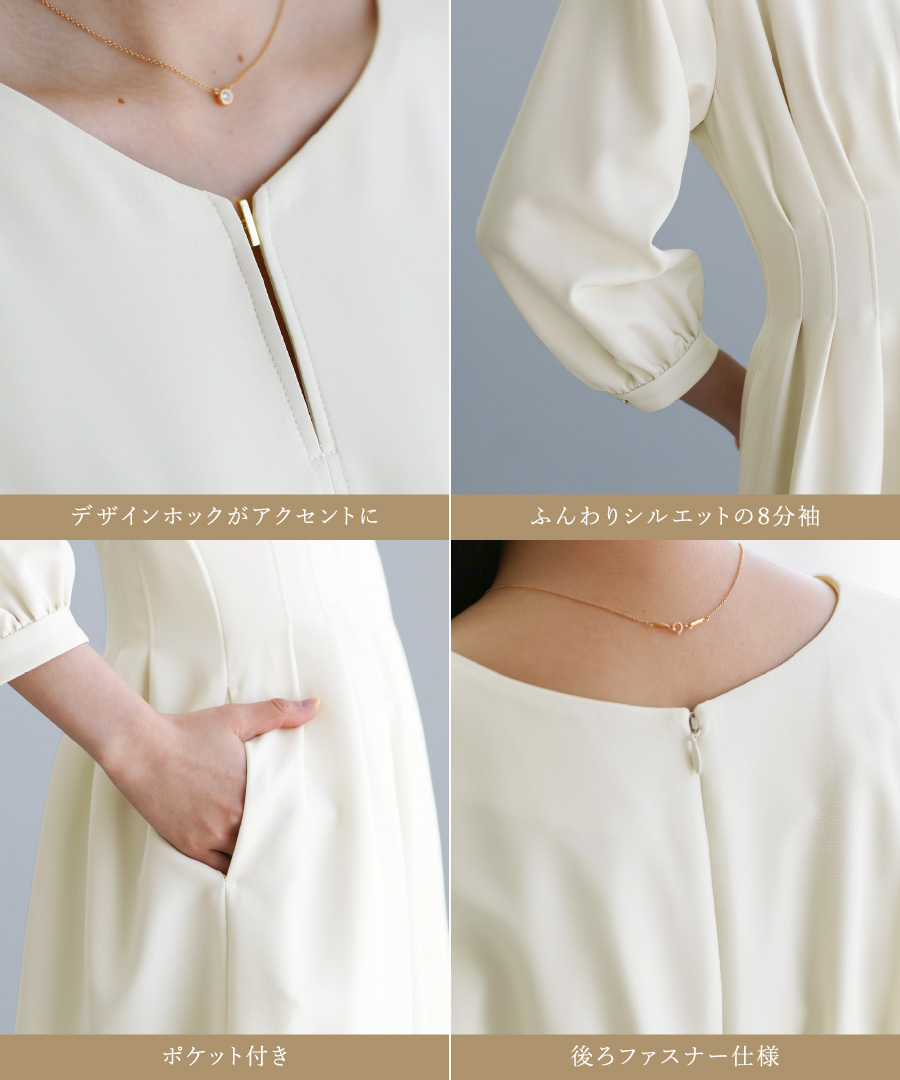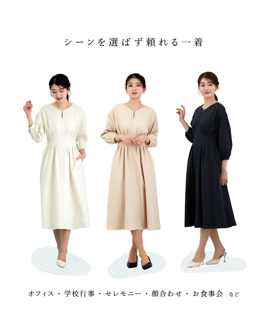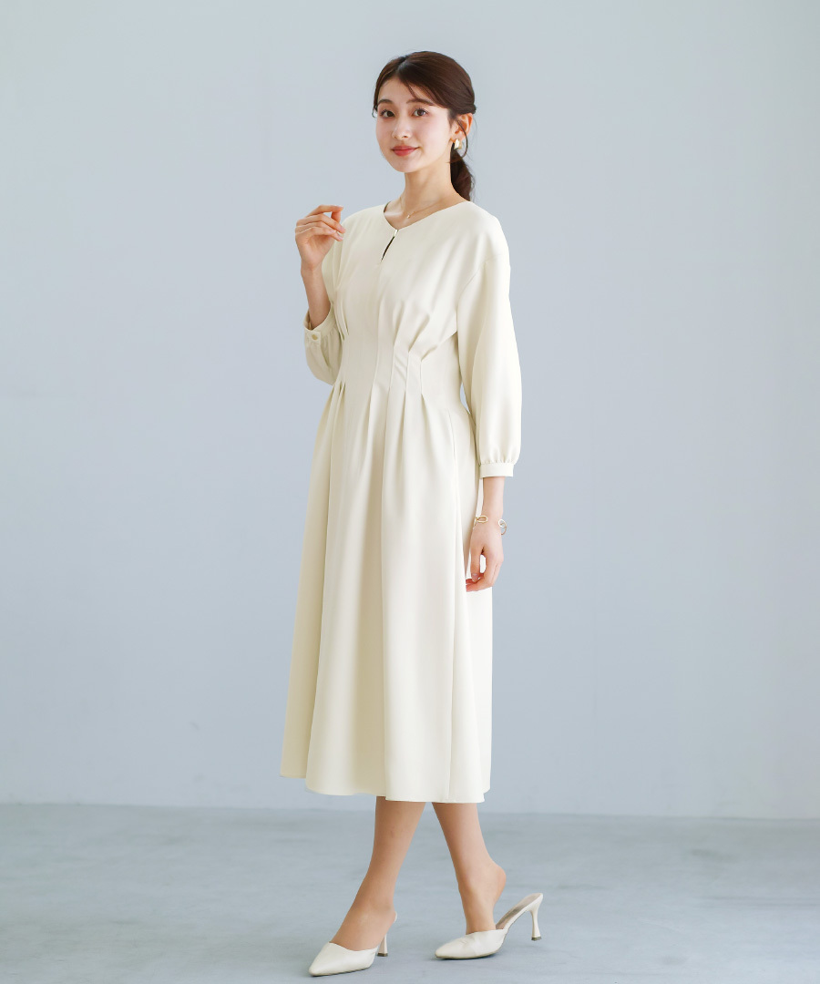 ワンピース きれいめワンピース オフィスワンピース セレモニーワンピース フォーマルワンピース ウエストタックワンピース ピケ素材ワンピース 8分袖ワンピース 細見えワンピース ポケット付きワンピース