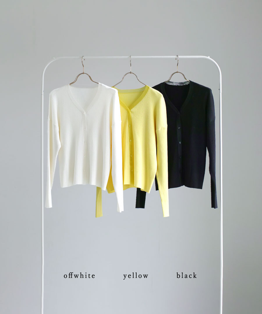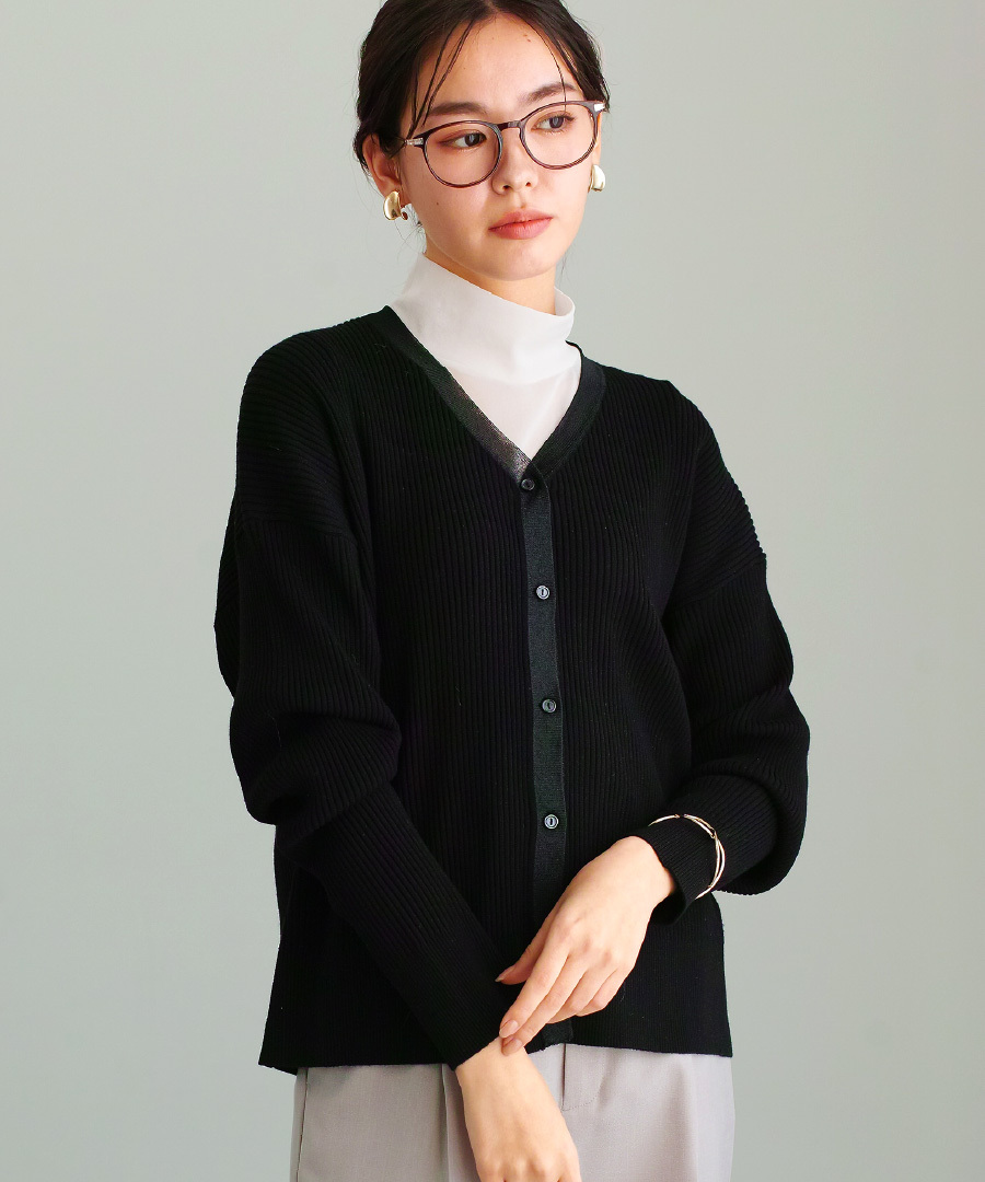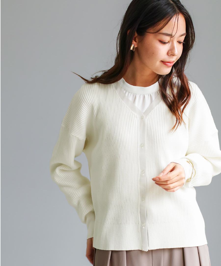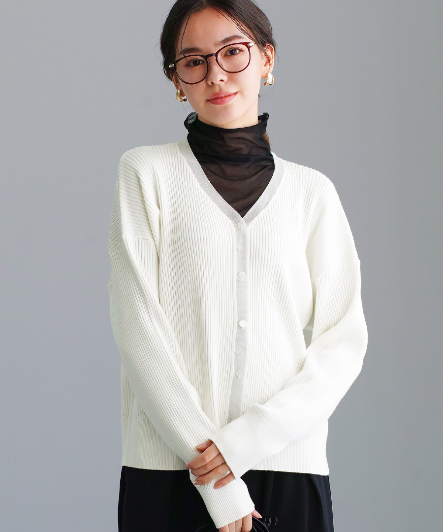 リブ編みニットを使用したVネックカーディガン。