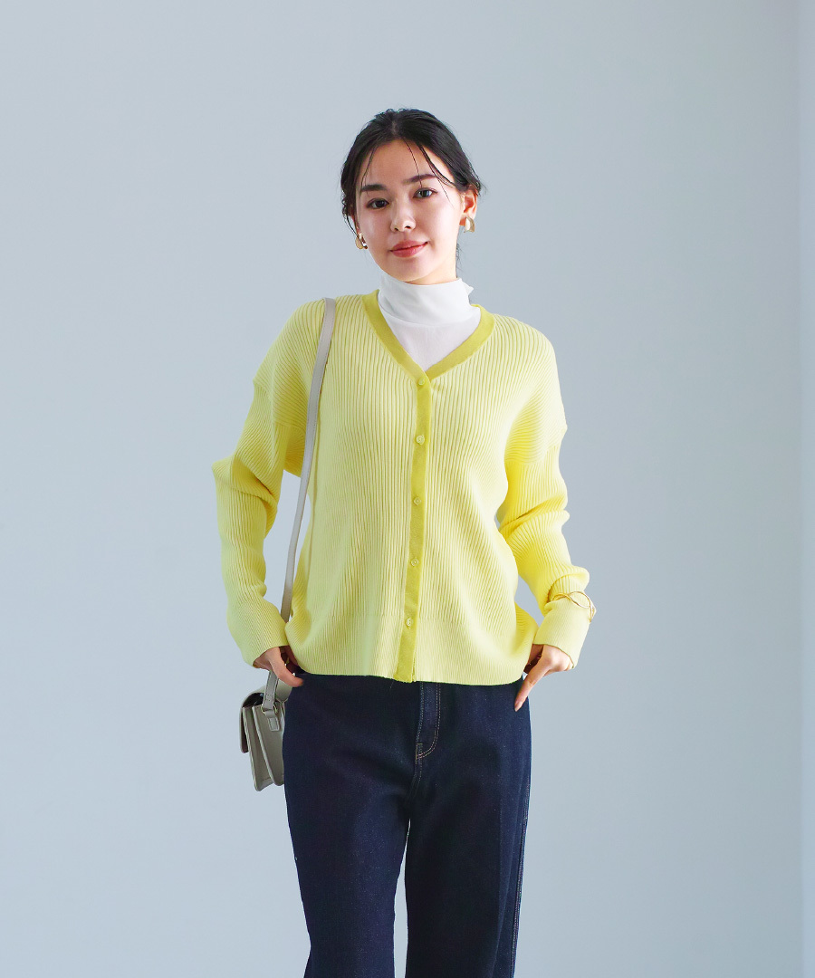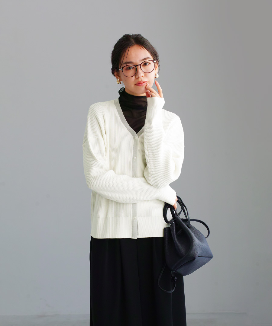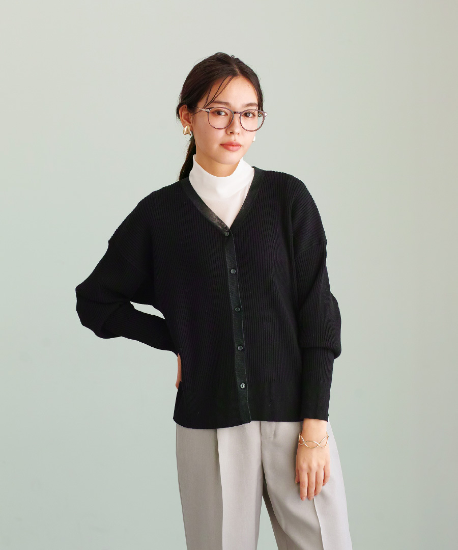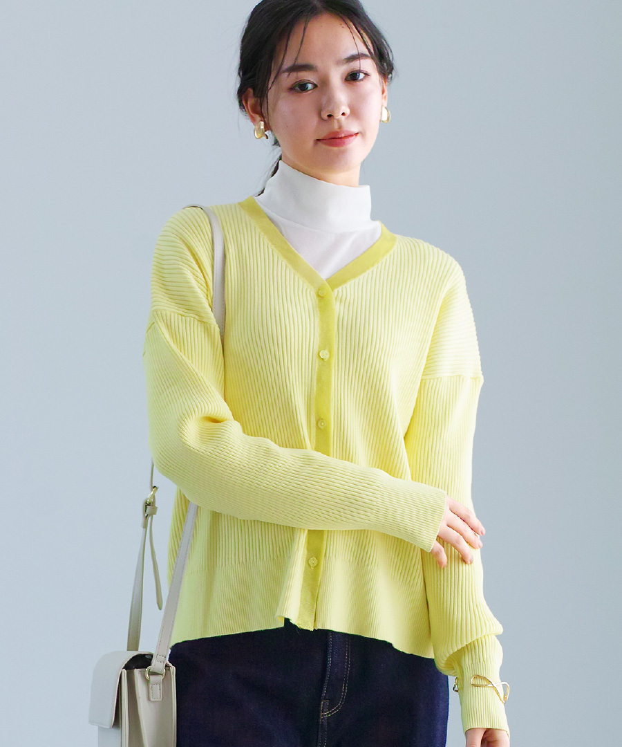 リブ編みニットを使用したVネックカーディガン。