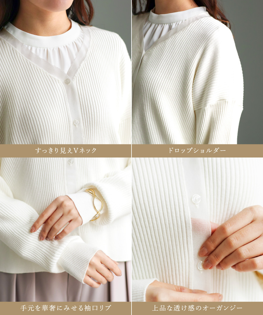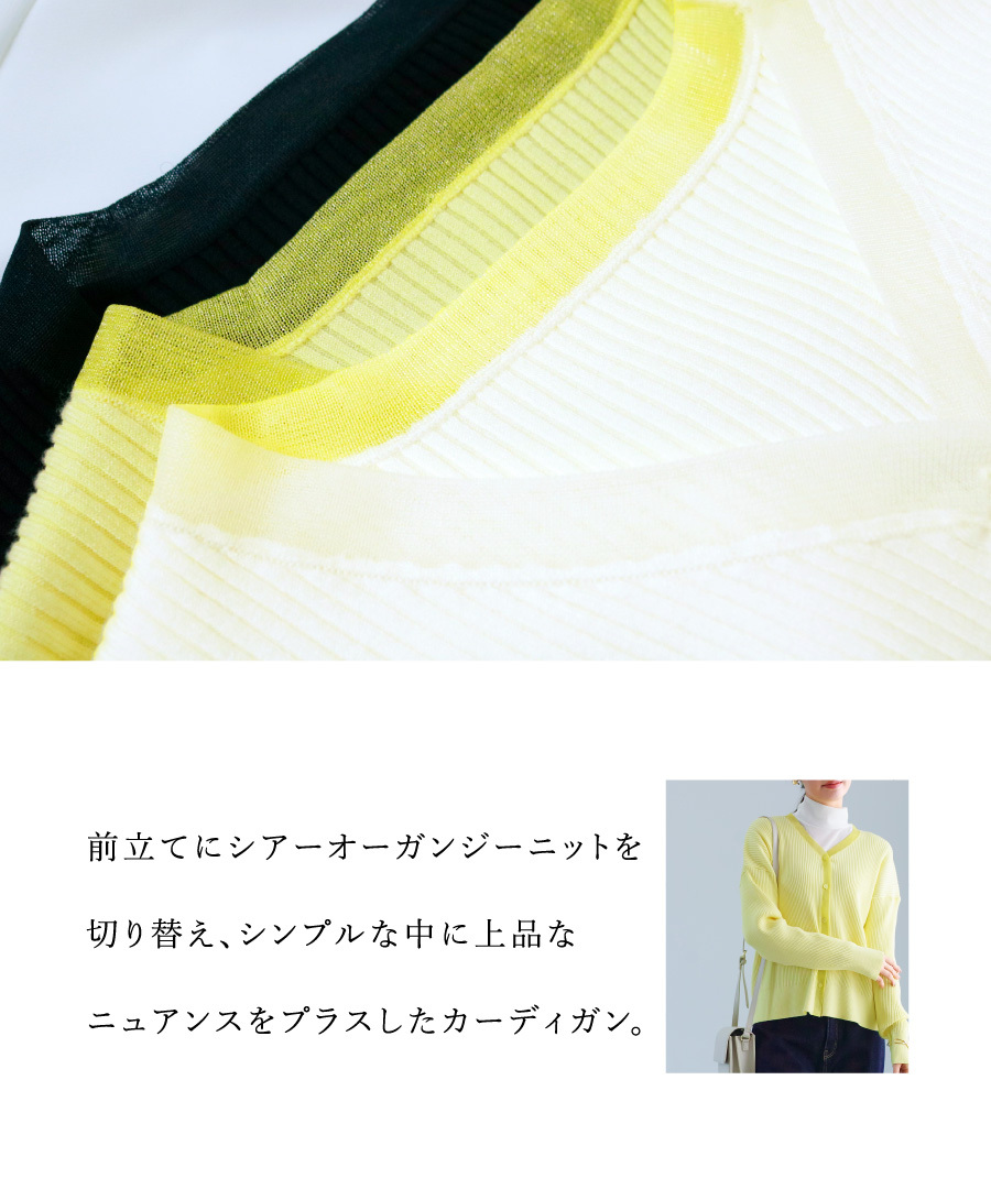 ニットカーディガン Vネックカーディガン オーガンジー切替 リブニット きれいめカーディガン オフィス デイリー 羽織り 上品 レディース