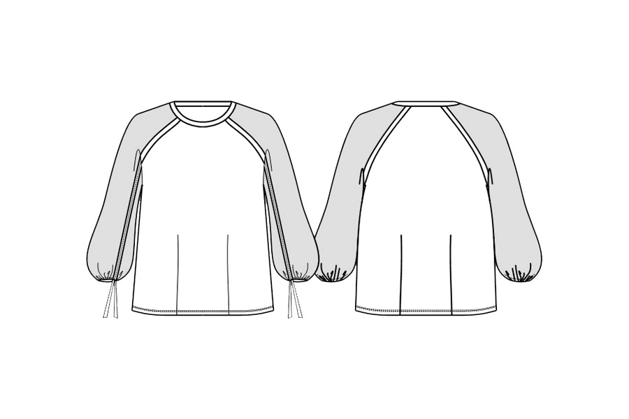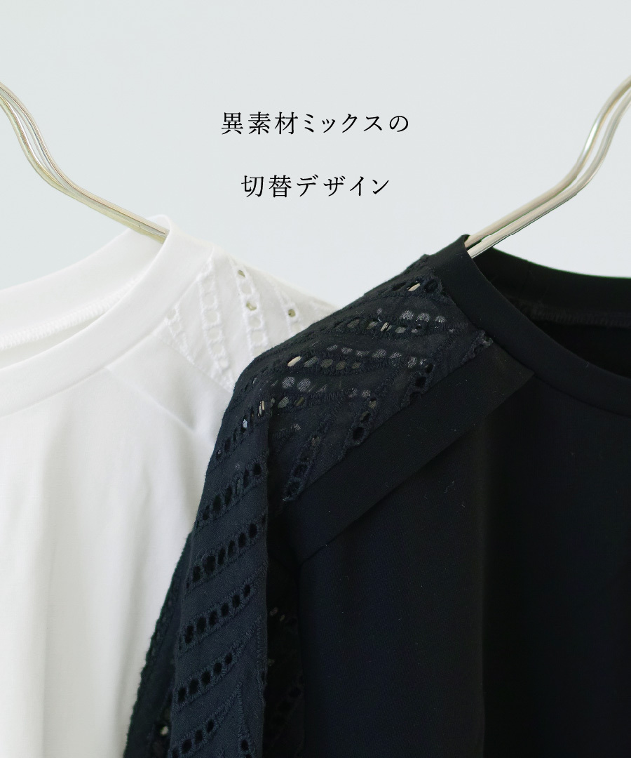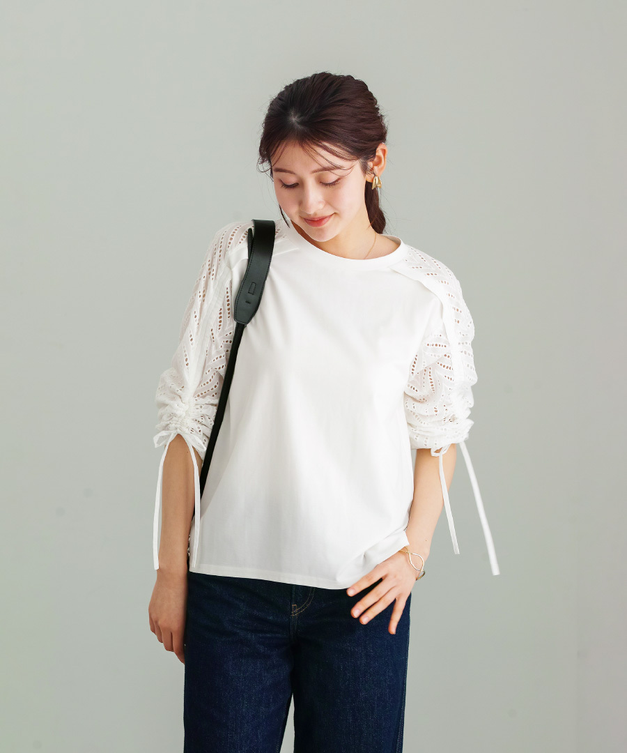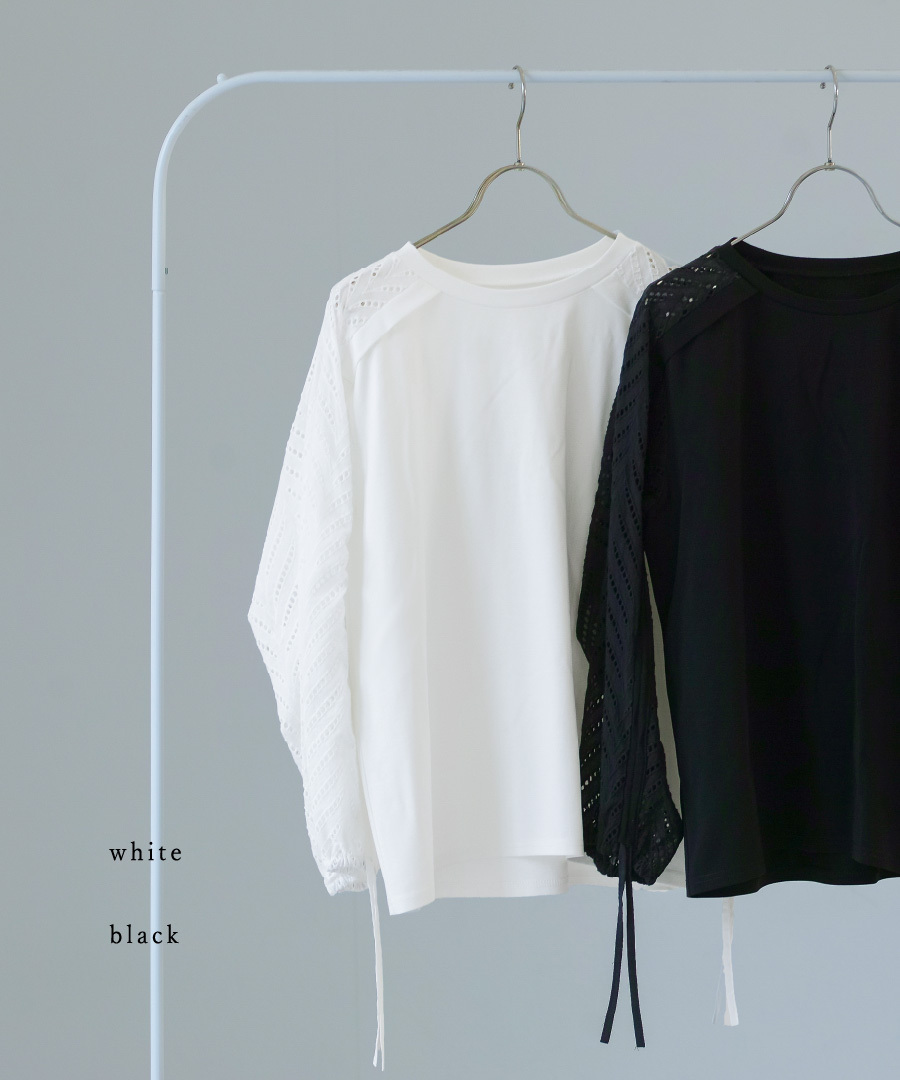 袖はラグラン切替に刺繍レースをあしらい、