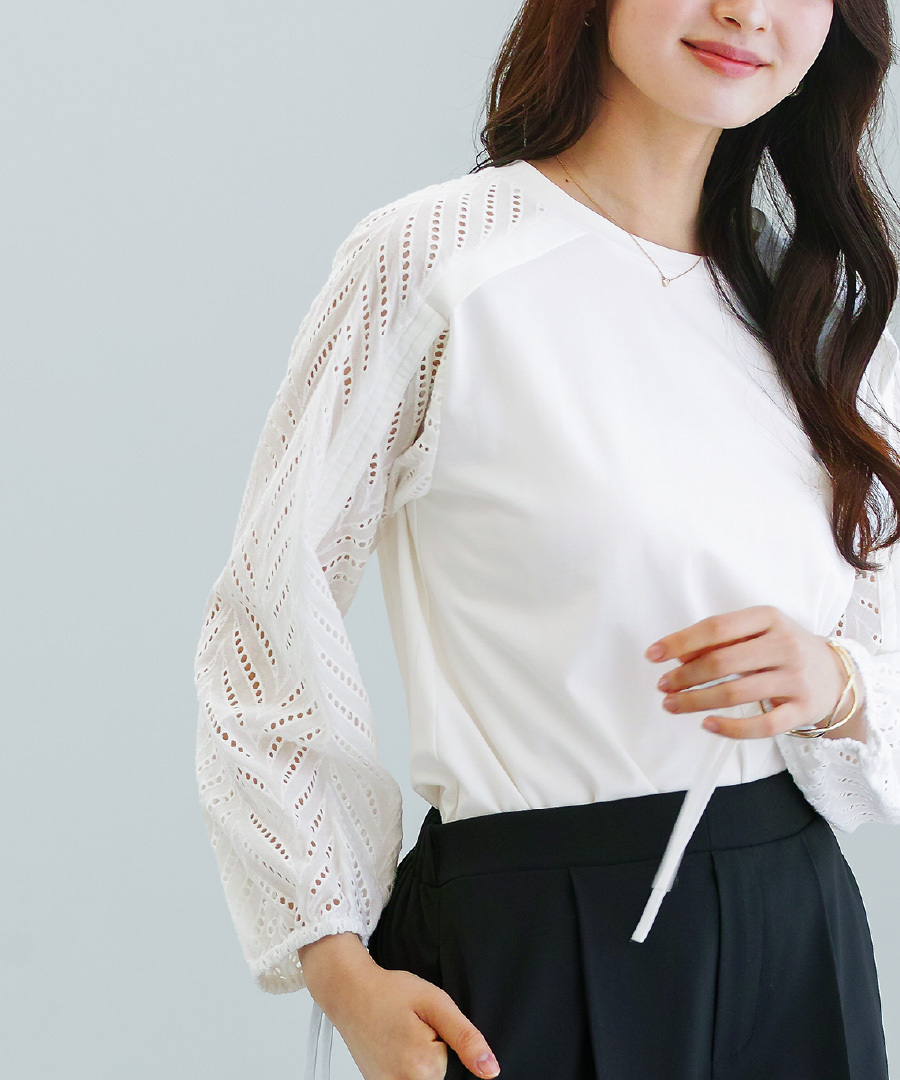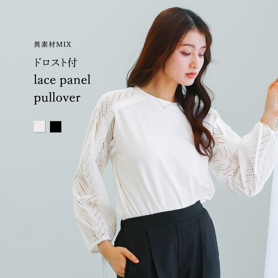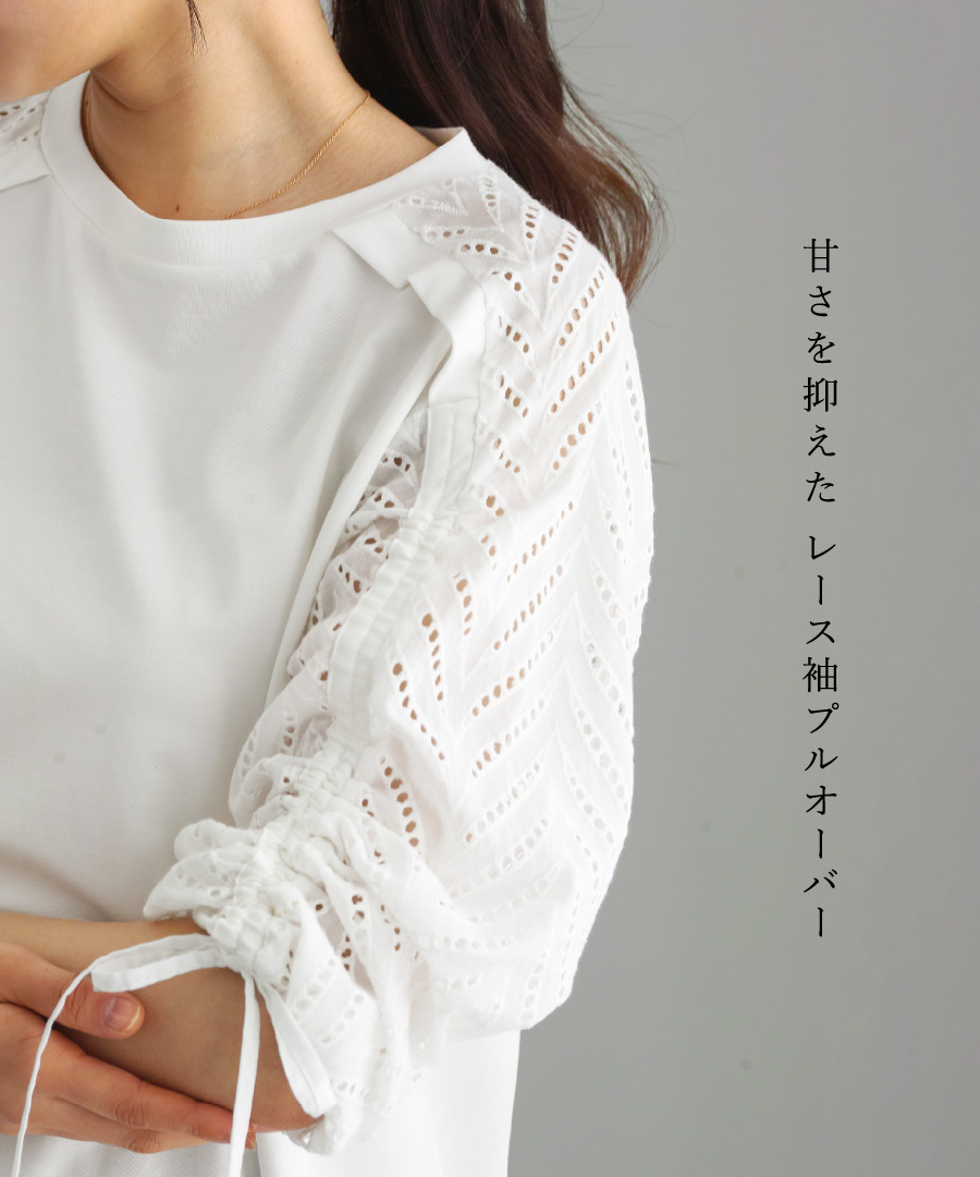 プルオーバー レース袖 刺繍レース ドロスト袖 異素材切替 きれいめカジュアル オフィスカジュアル 後ろ長め トップス レディース 刺繍レース