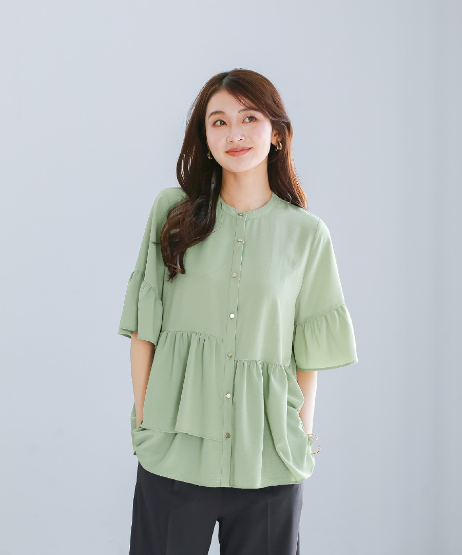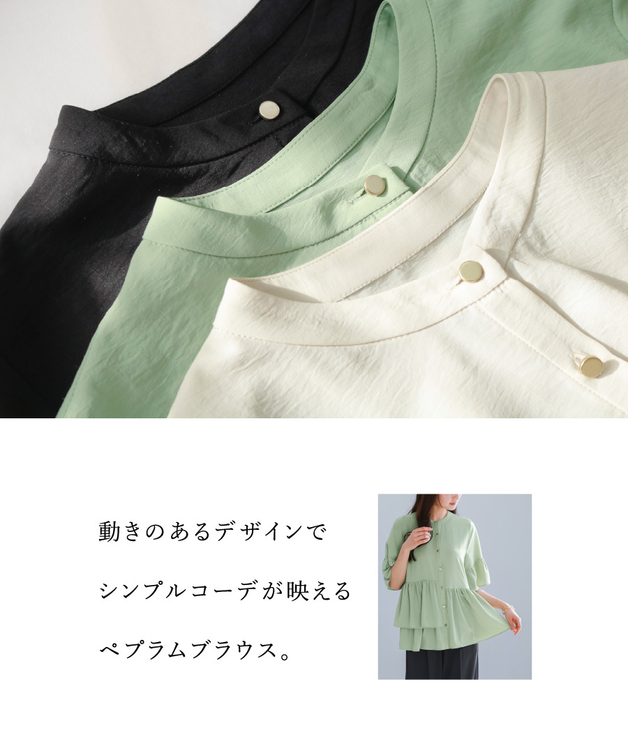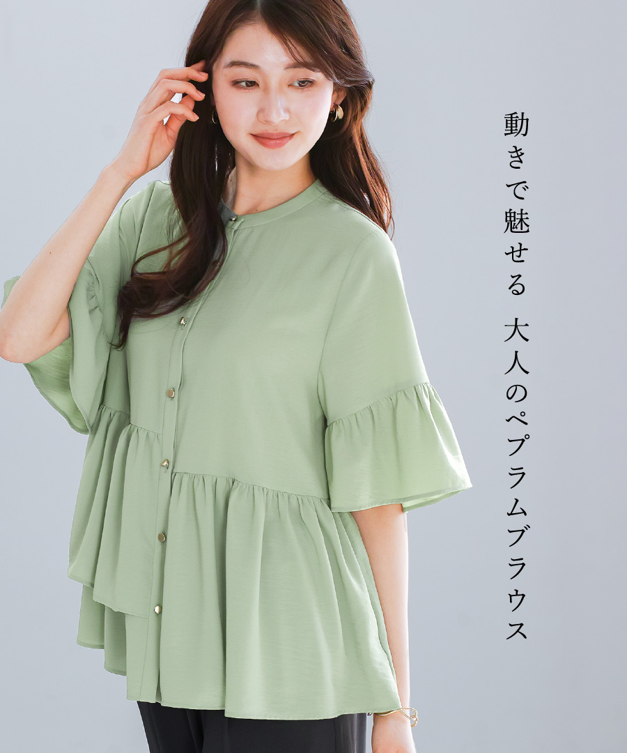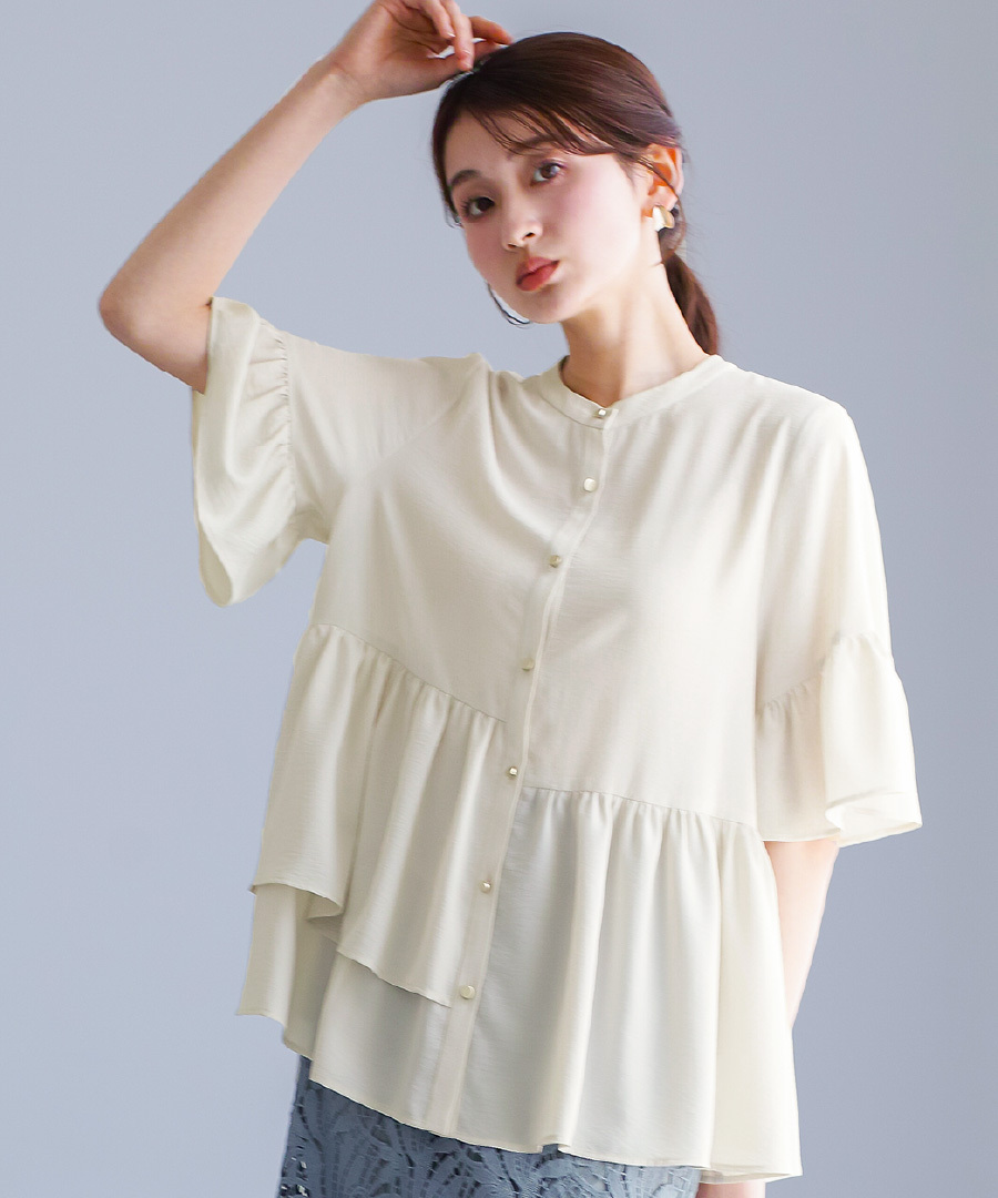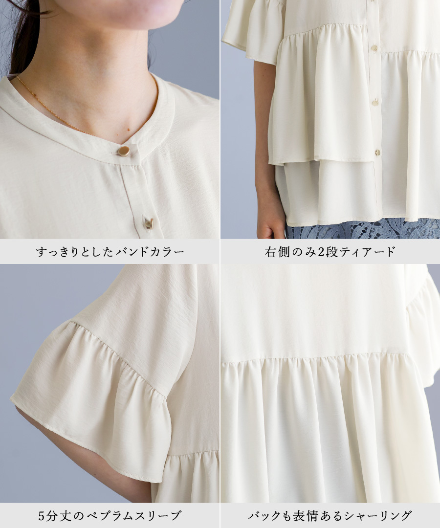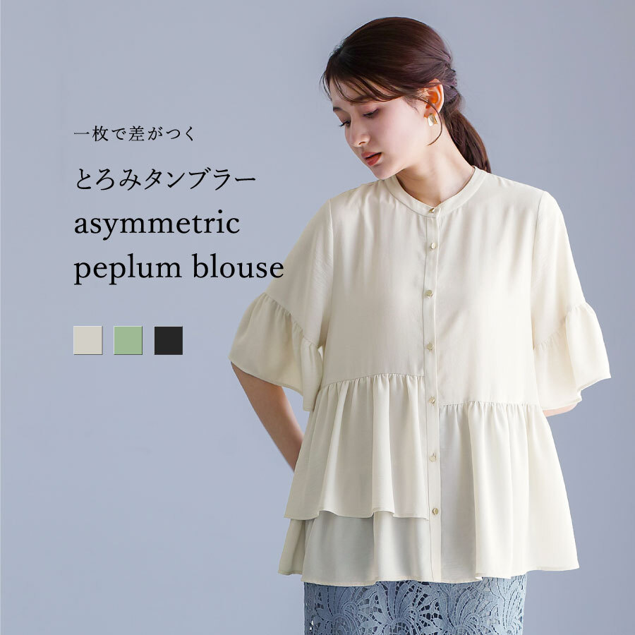 ブラウス 半袖 ペプラム アシンメトリー ティアード バンドカラー とろみ素材 きれいめ 体型カバー 夏トップス