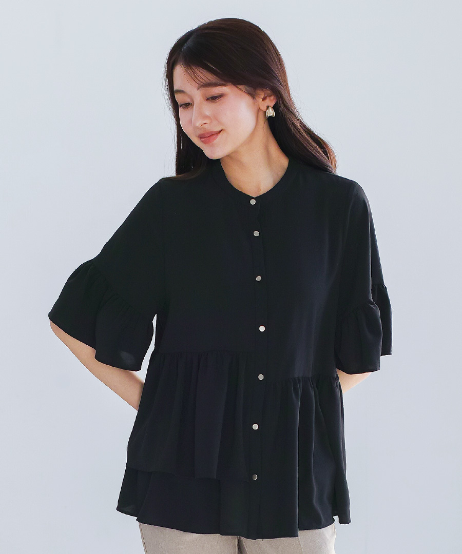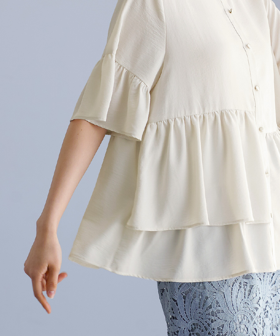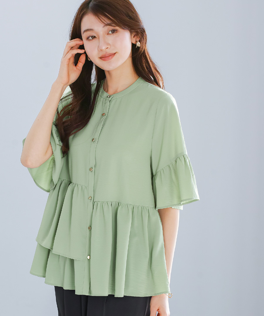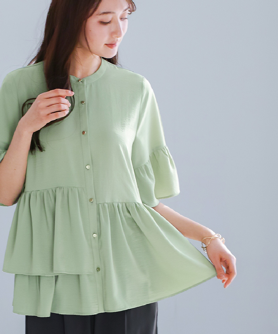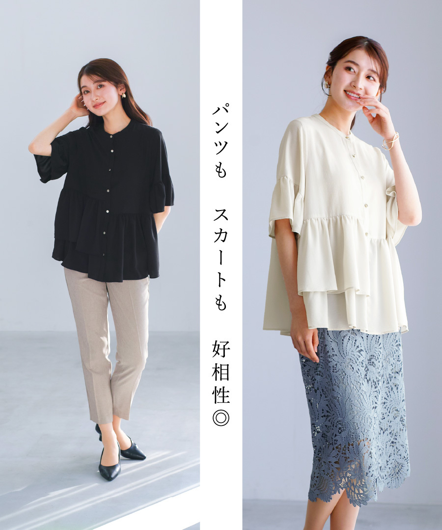 ブラウス 半袖 ペプラム アシンメトリー ティアード バンドカラー とろみ素材 きれいめ 体型カバー 夏トップス