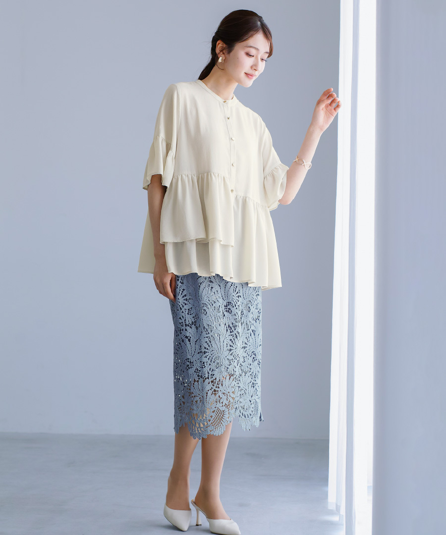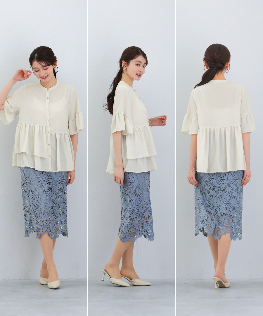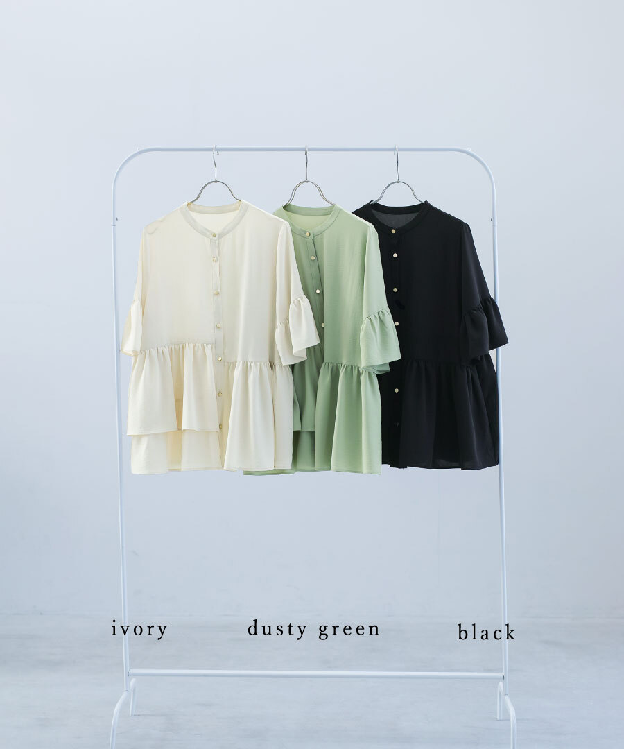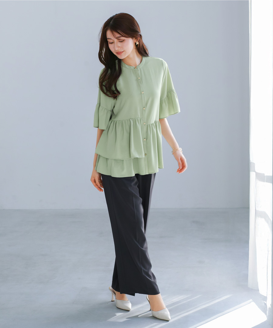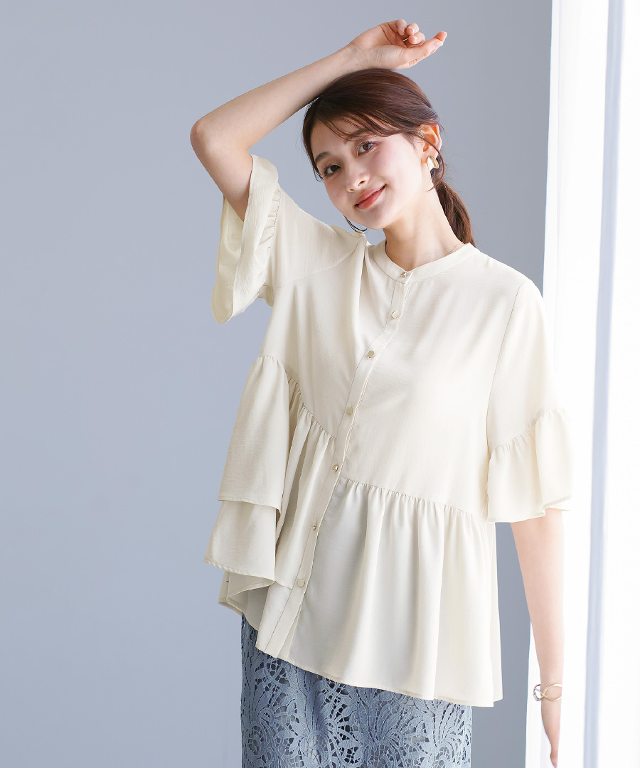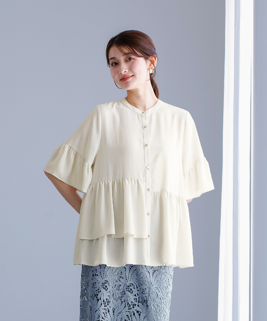 ブラウス 半袖 ペプラム アシンメトリー ティアード バンドカラー とろみ素材 きれいめ 体型カバー 夏トップス
