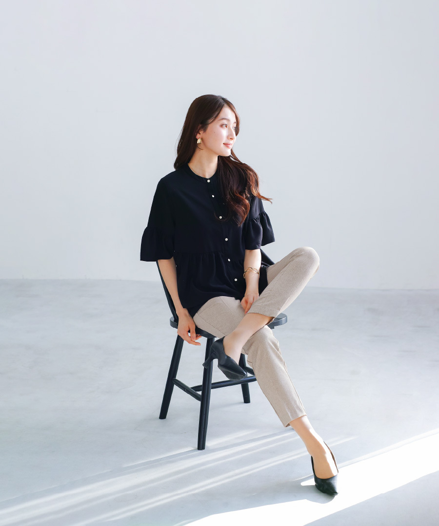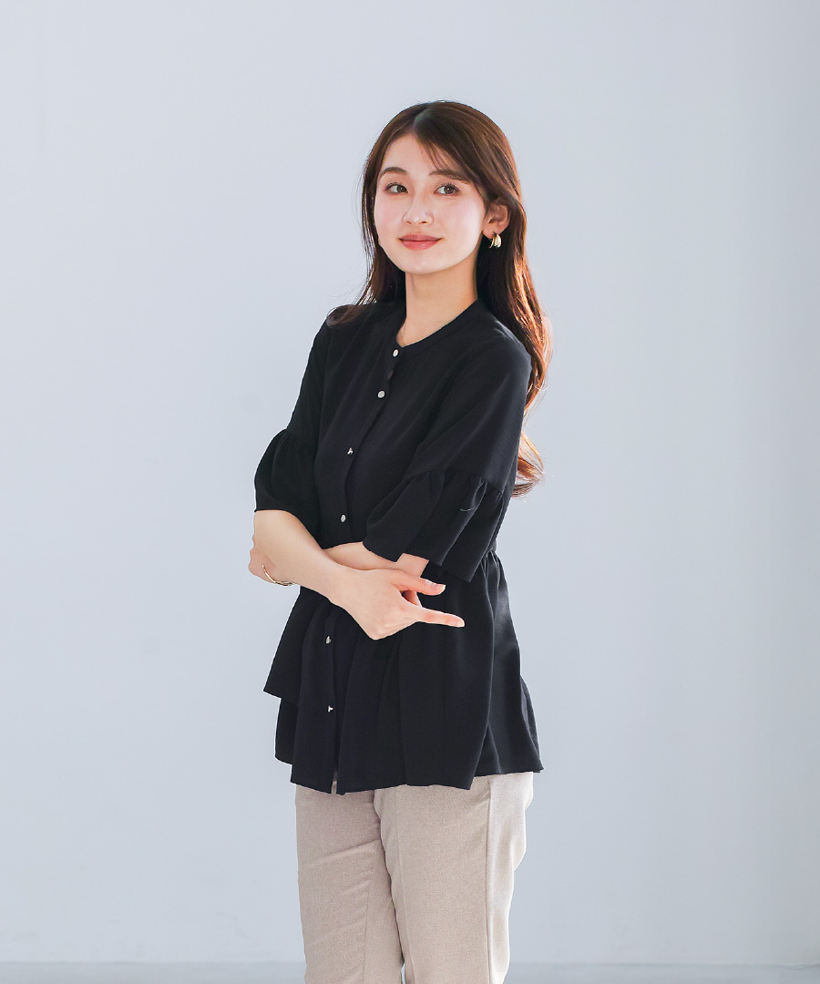 軽やかさと上品さを兼ね備えたデザインブラウスです。
