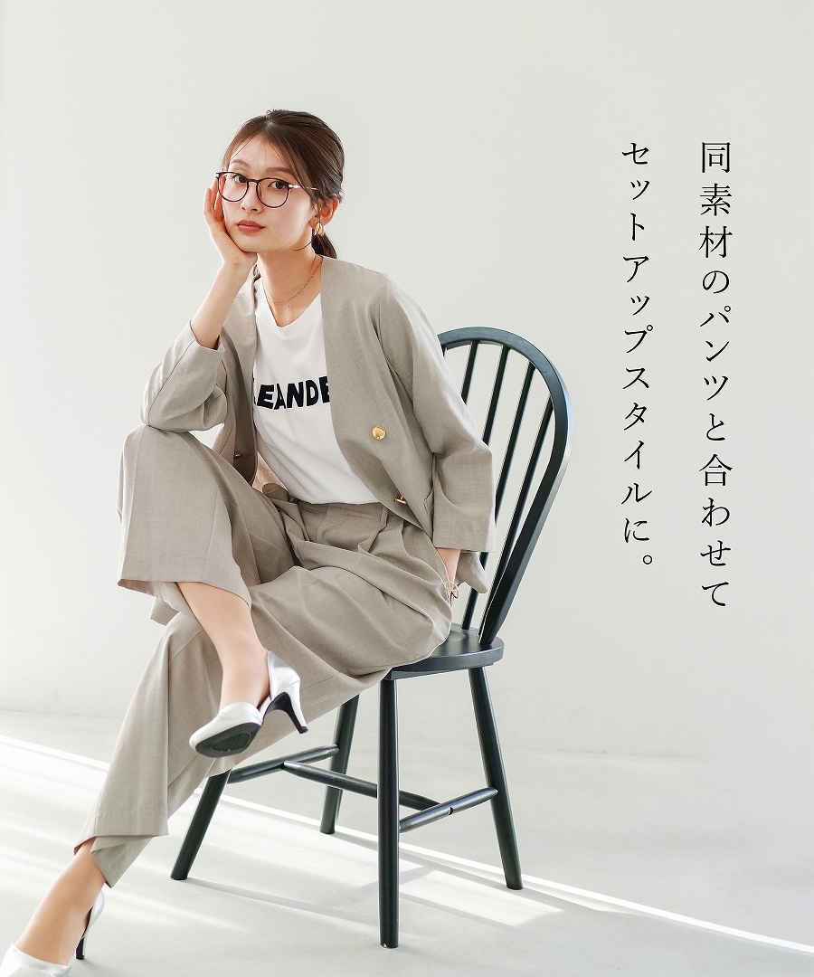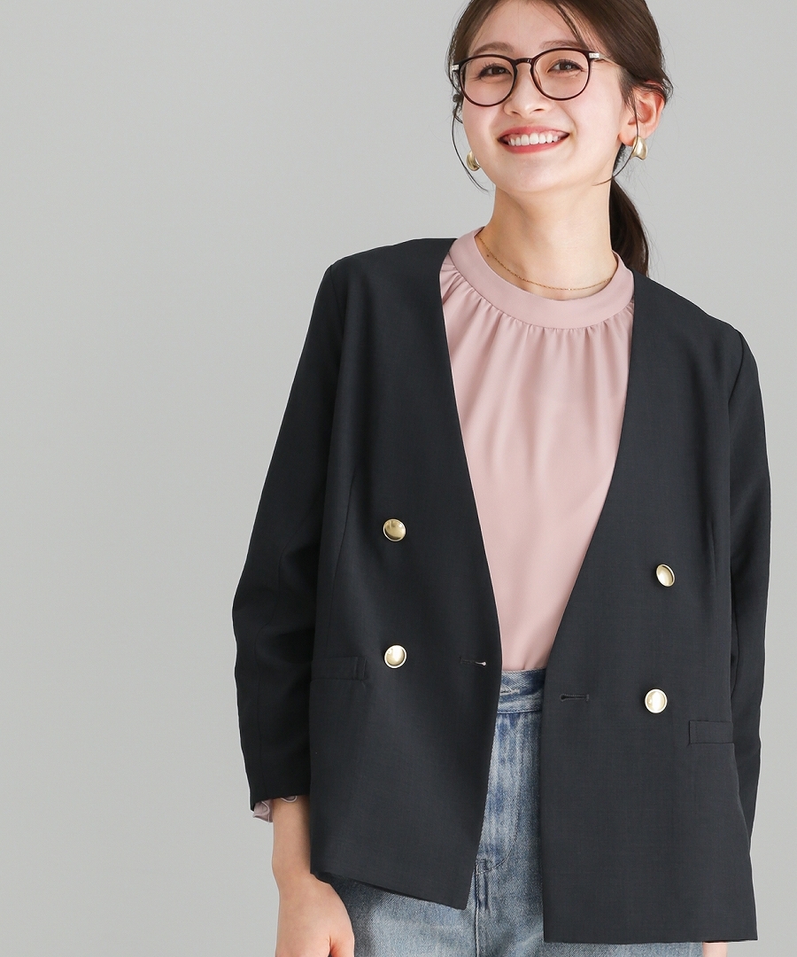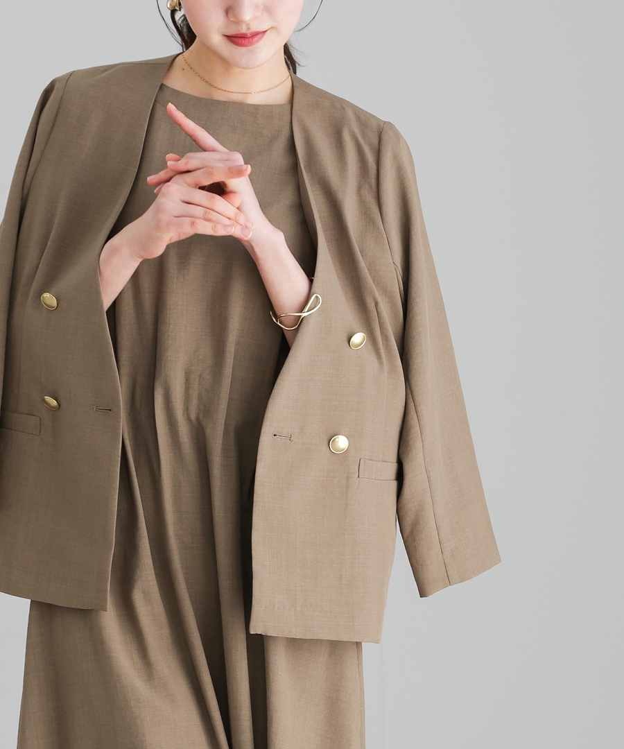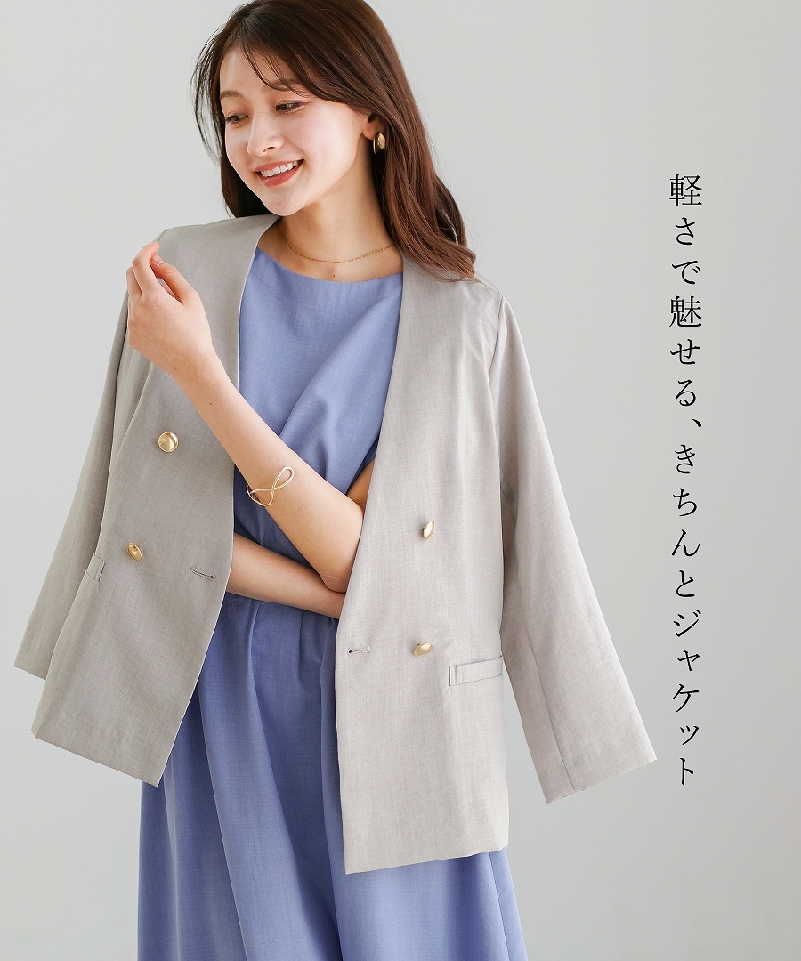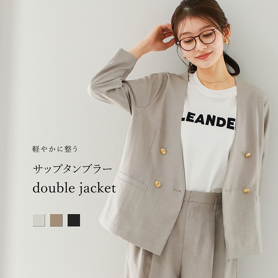 サップタンブラー ダブルジャケット 夏ジャケット 軽量ジャケット 涼しいジャケット ノーカラージャケット オフィスコーデ セットアップ対応 ゴールドボタン 通勤スタイル