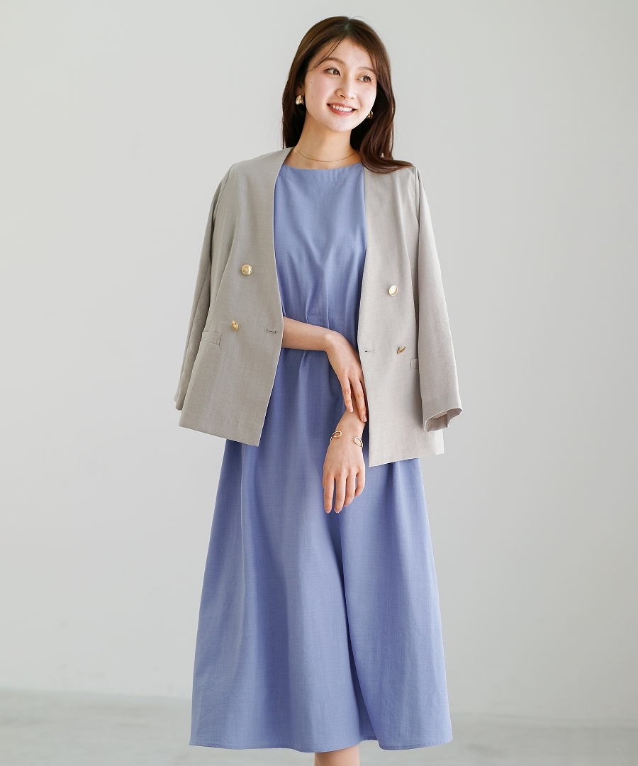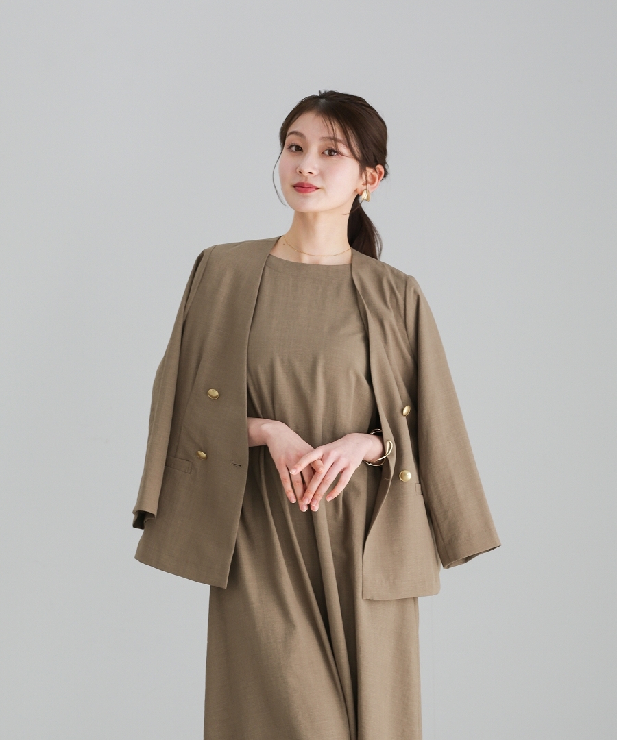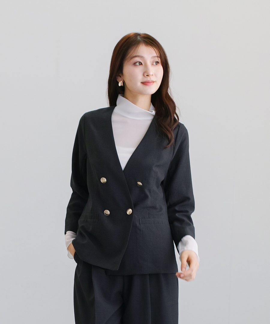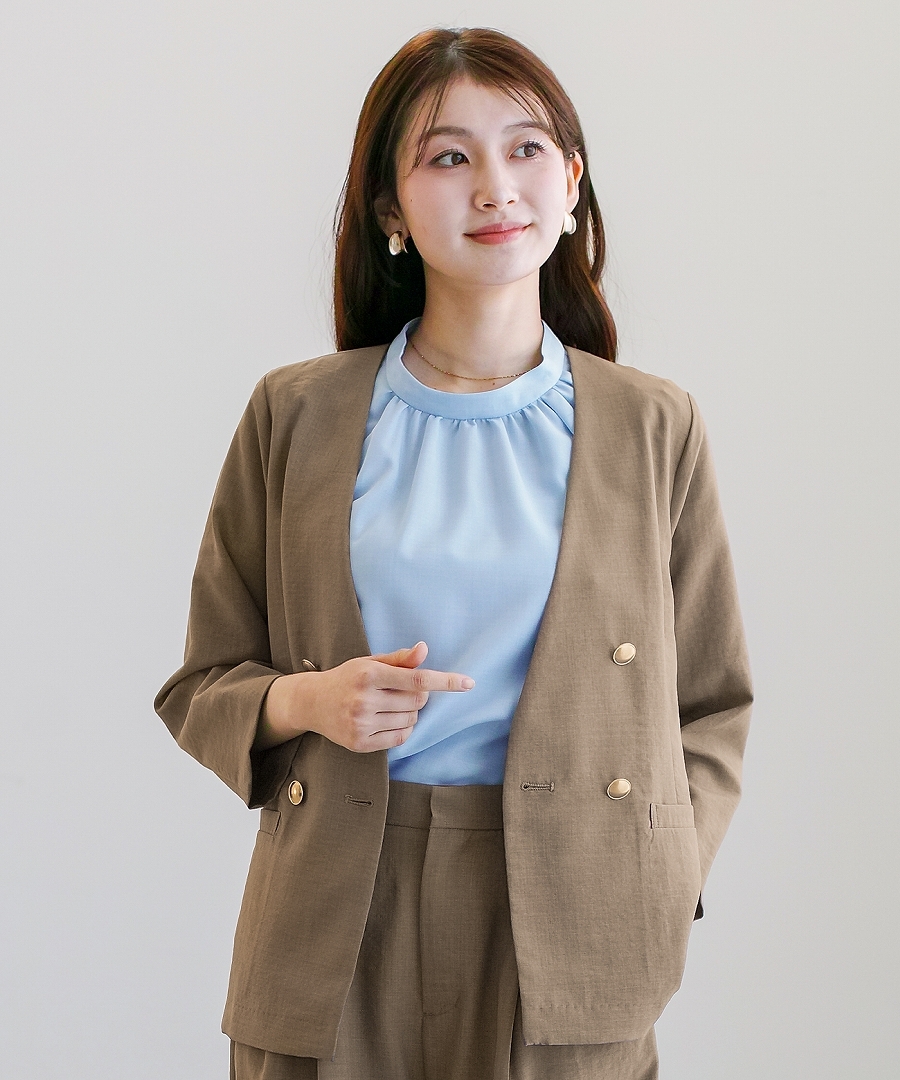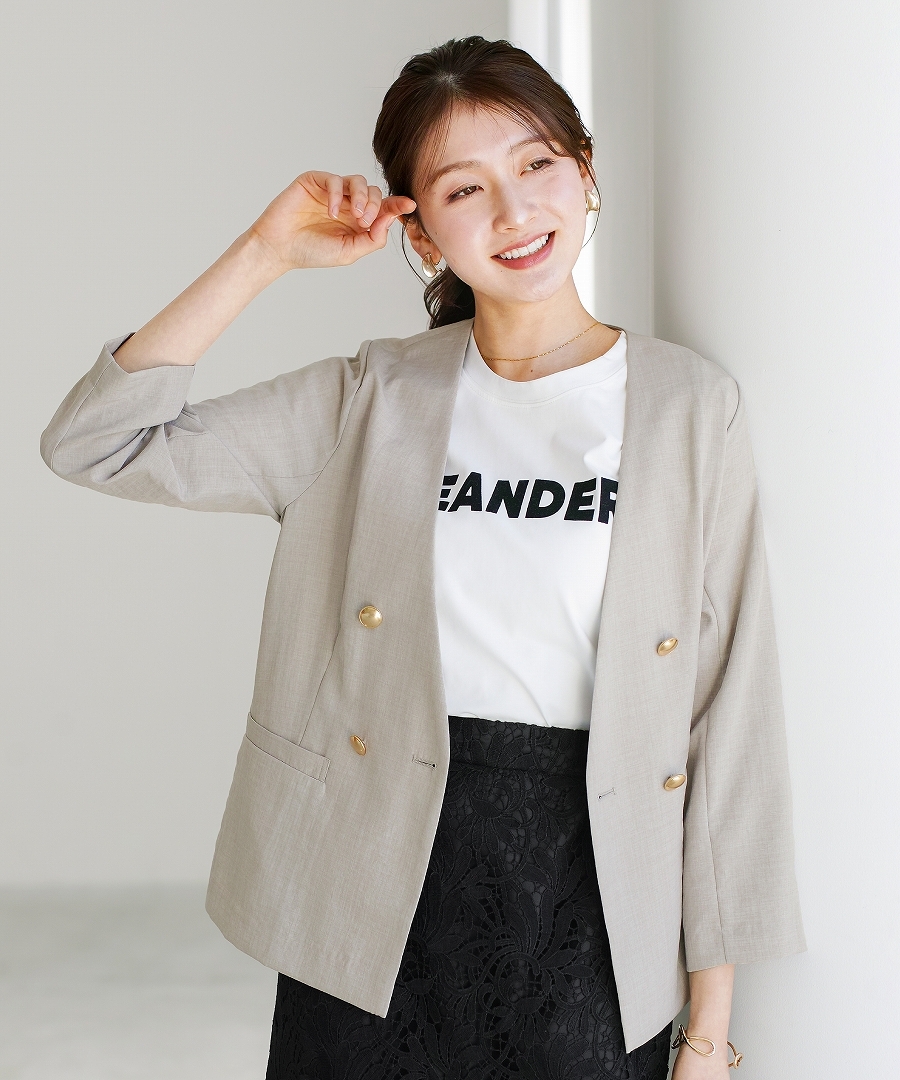 サップタンブラー ダブルジャケット 夏ジャケット 軽量ジャケット 涼しいジャケット ノーカラージャケット オフィスコーデ セットアップ対応 ゴールドボタン 通勤スタイル