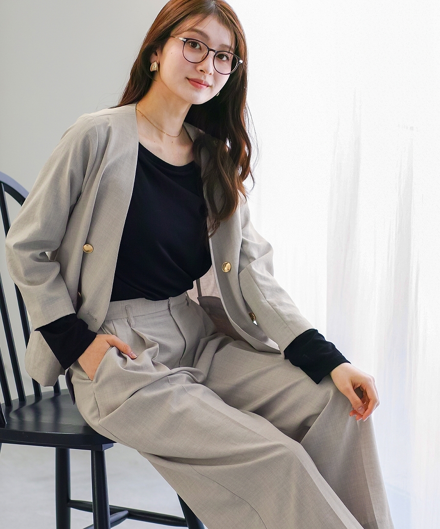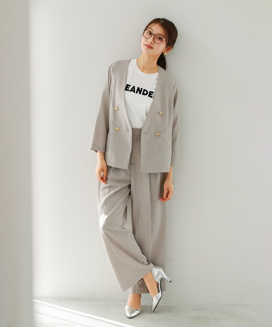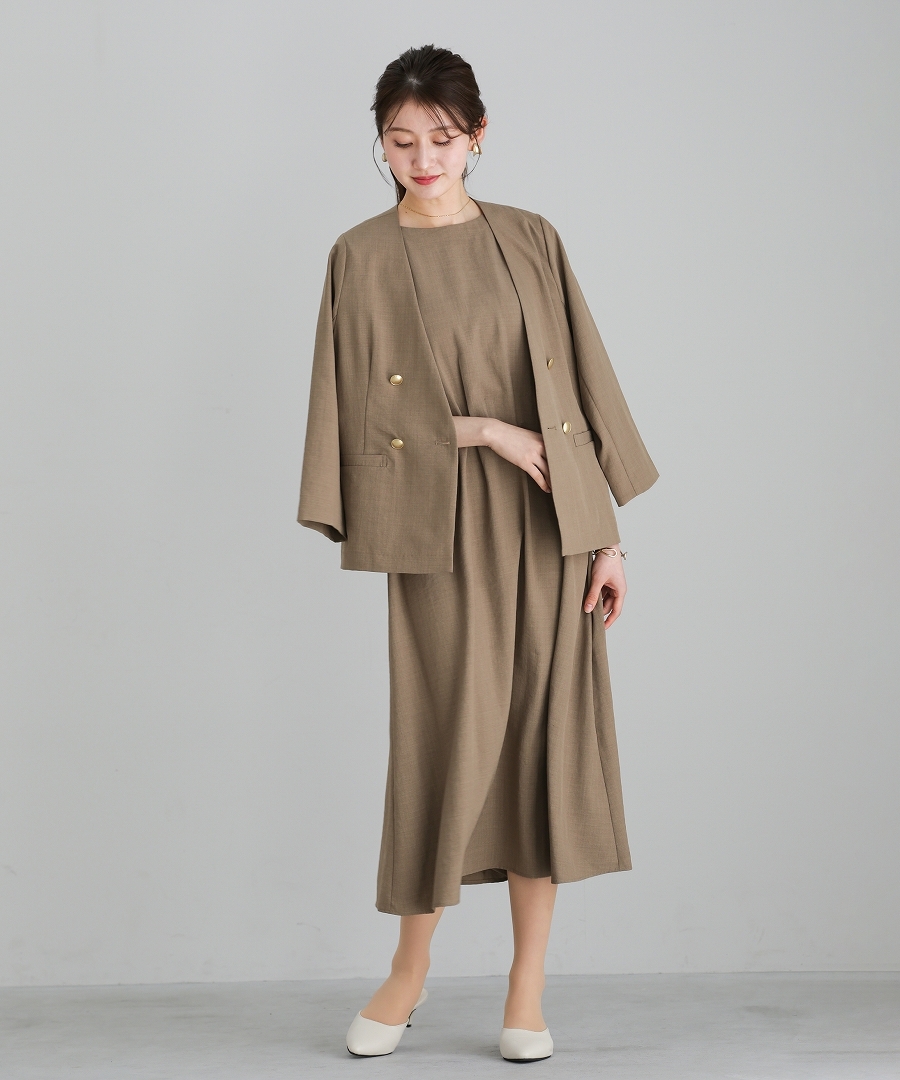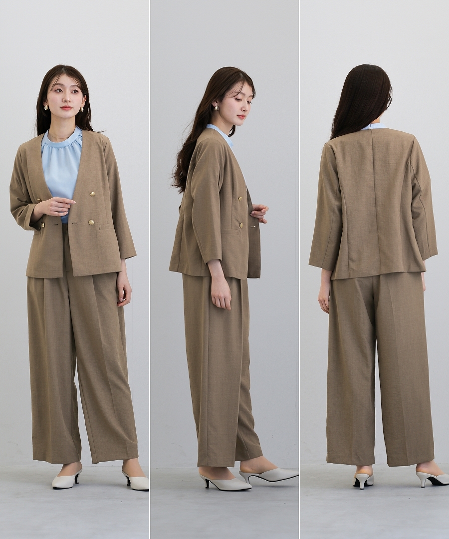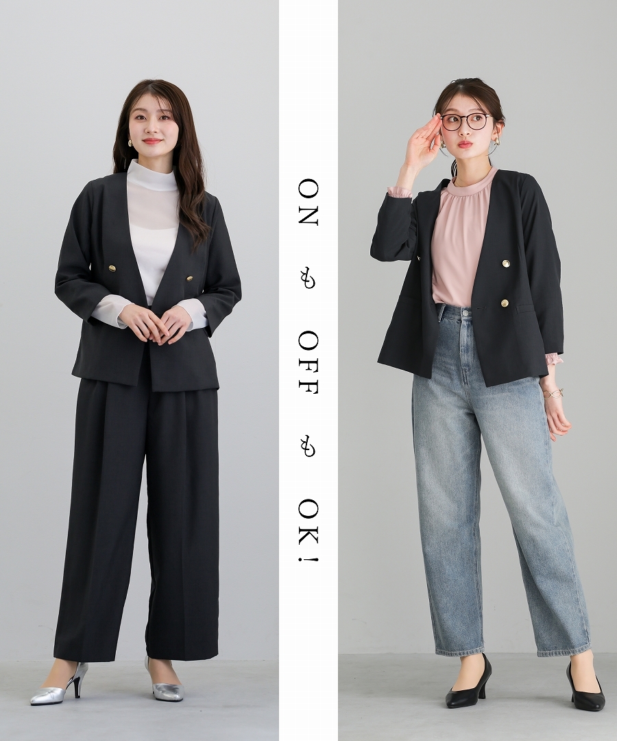 サップタンブラー ダブルジャケット 夏ジャケット 軽量ジャケット 涼しいジャケット ノーカラージャケット オフィスコーデ セットアップ対応 ゴールドボタン 通勤スタイル