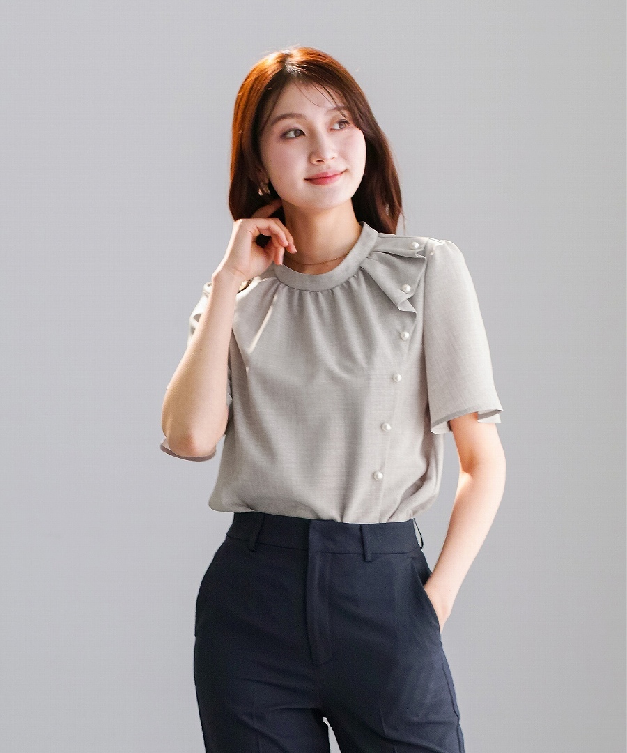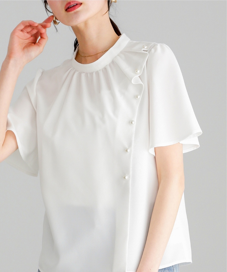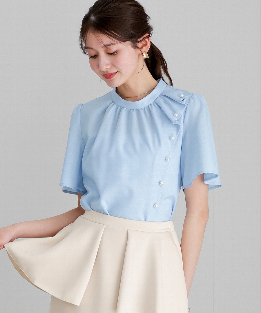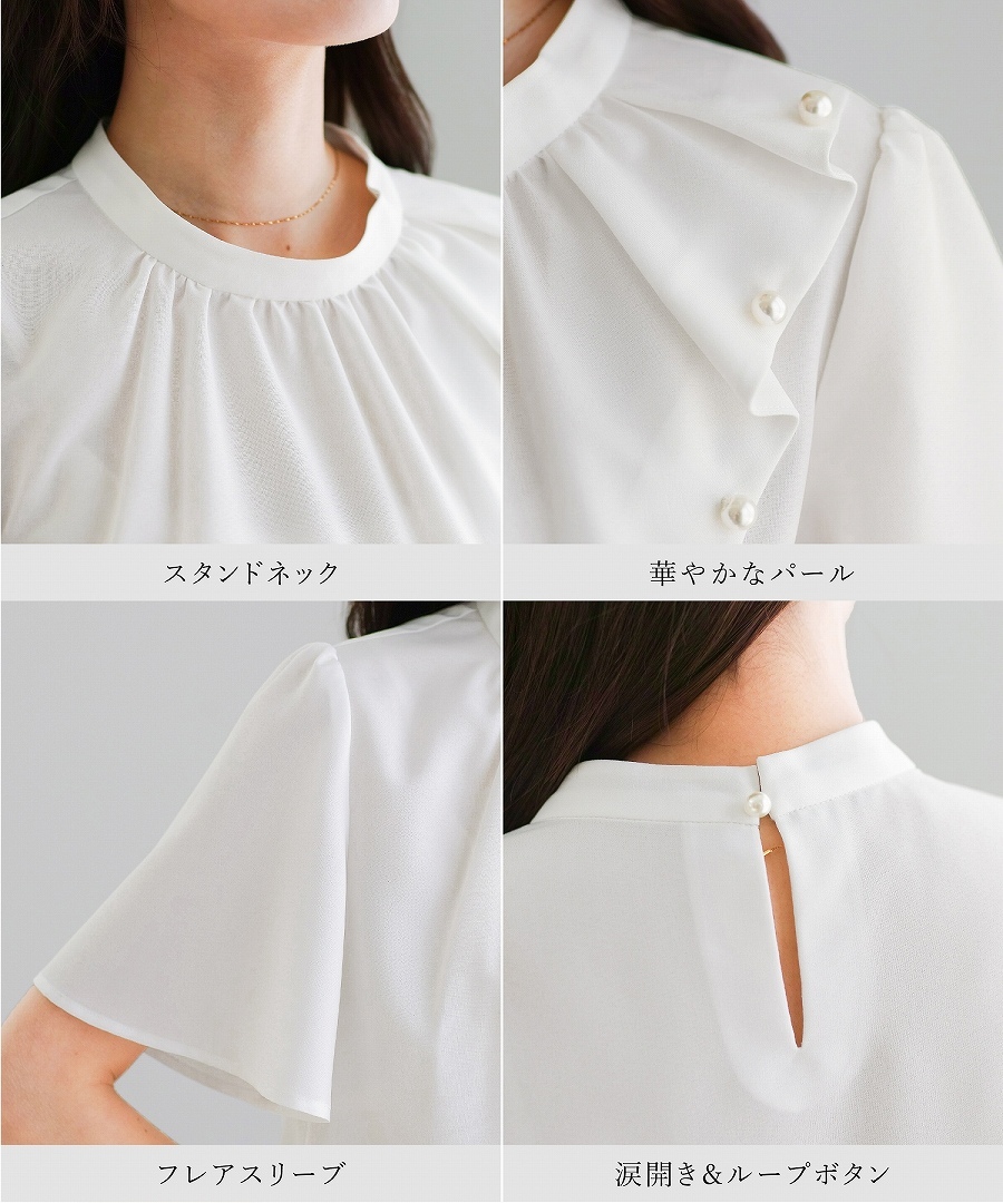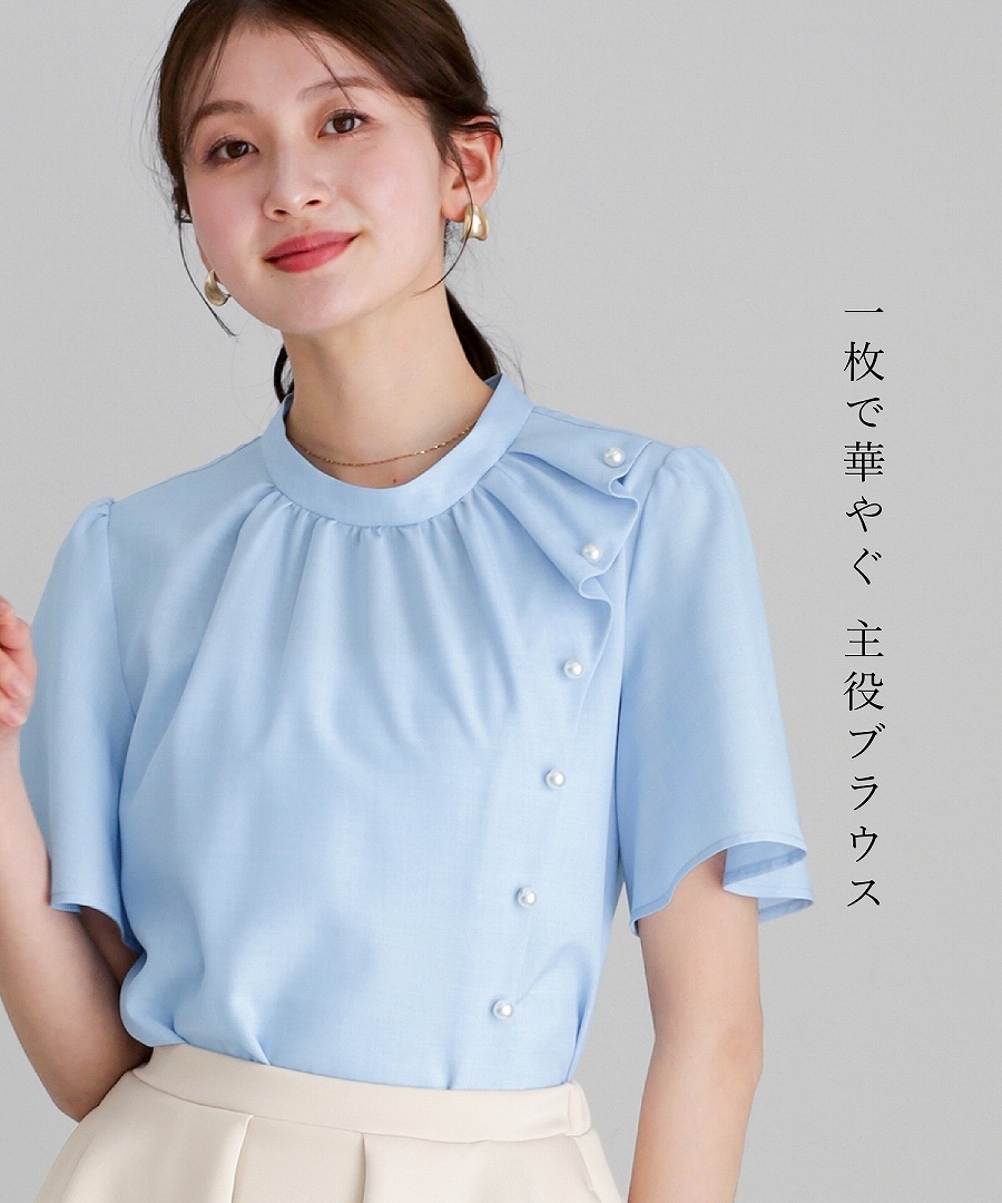 ブラウス 半袖ブラウス パールブラウス フリルブラウス きれいめブラウス オフィスコーデ 夏ブラウス レディーストップス 通勤コーデ 上品トップス