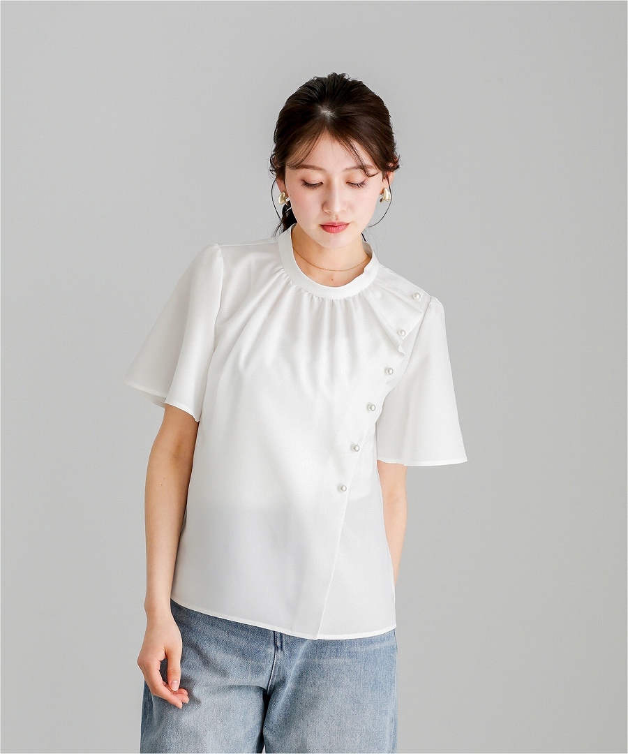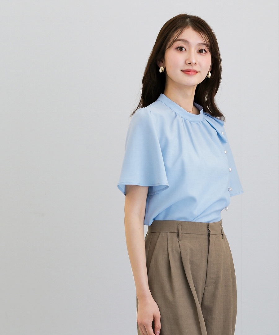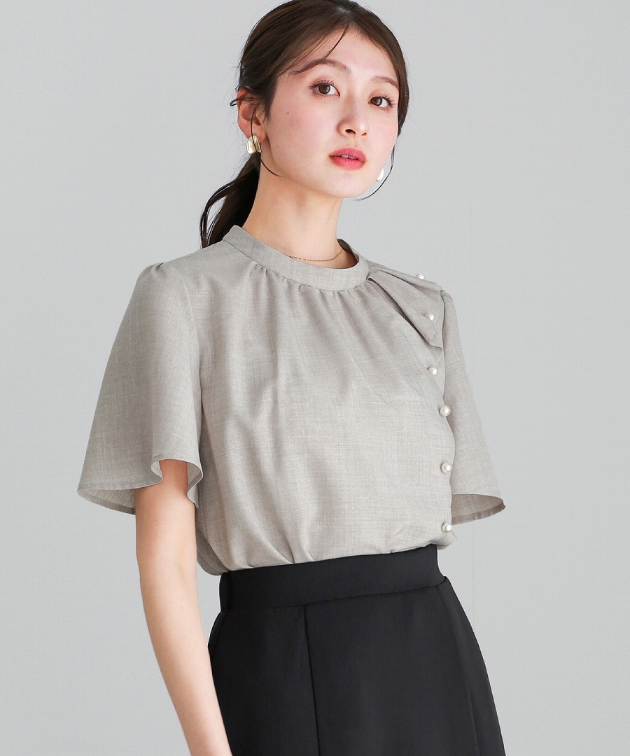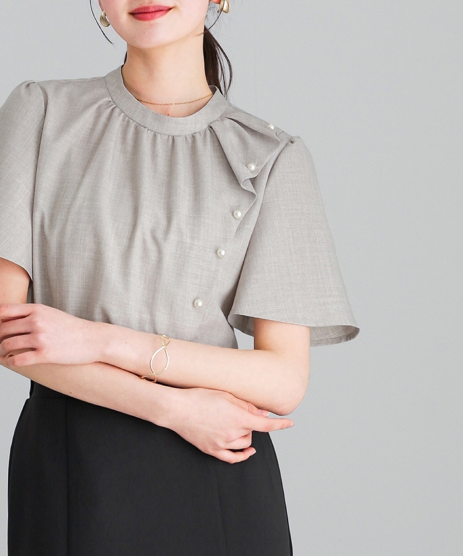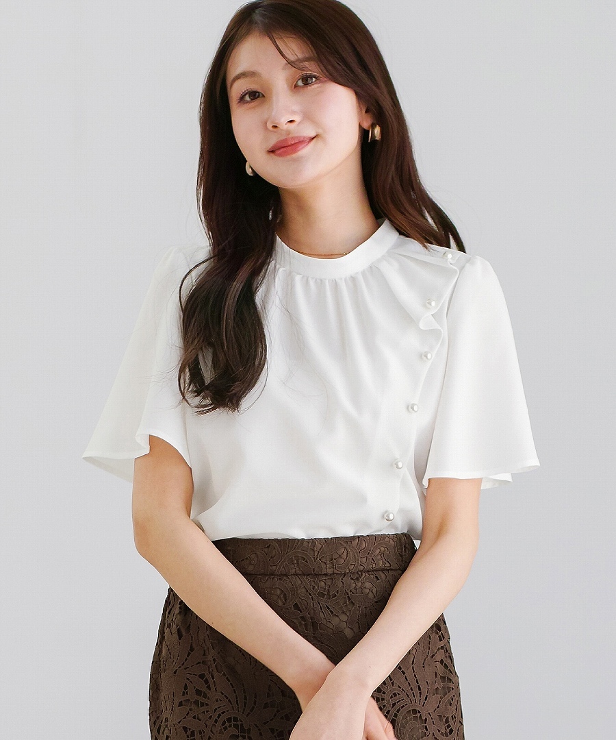 ブラウス 半袖ブラウス パールブラウス フリルブラウス きれいめブラウス オフィスコーデ 夏ブラウス レディーストップス 通勤コーデ 上品トップス