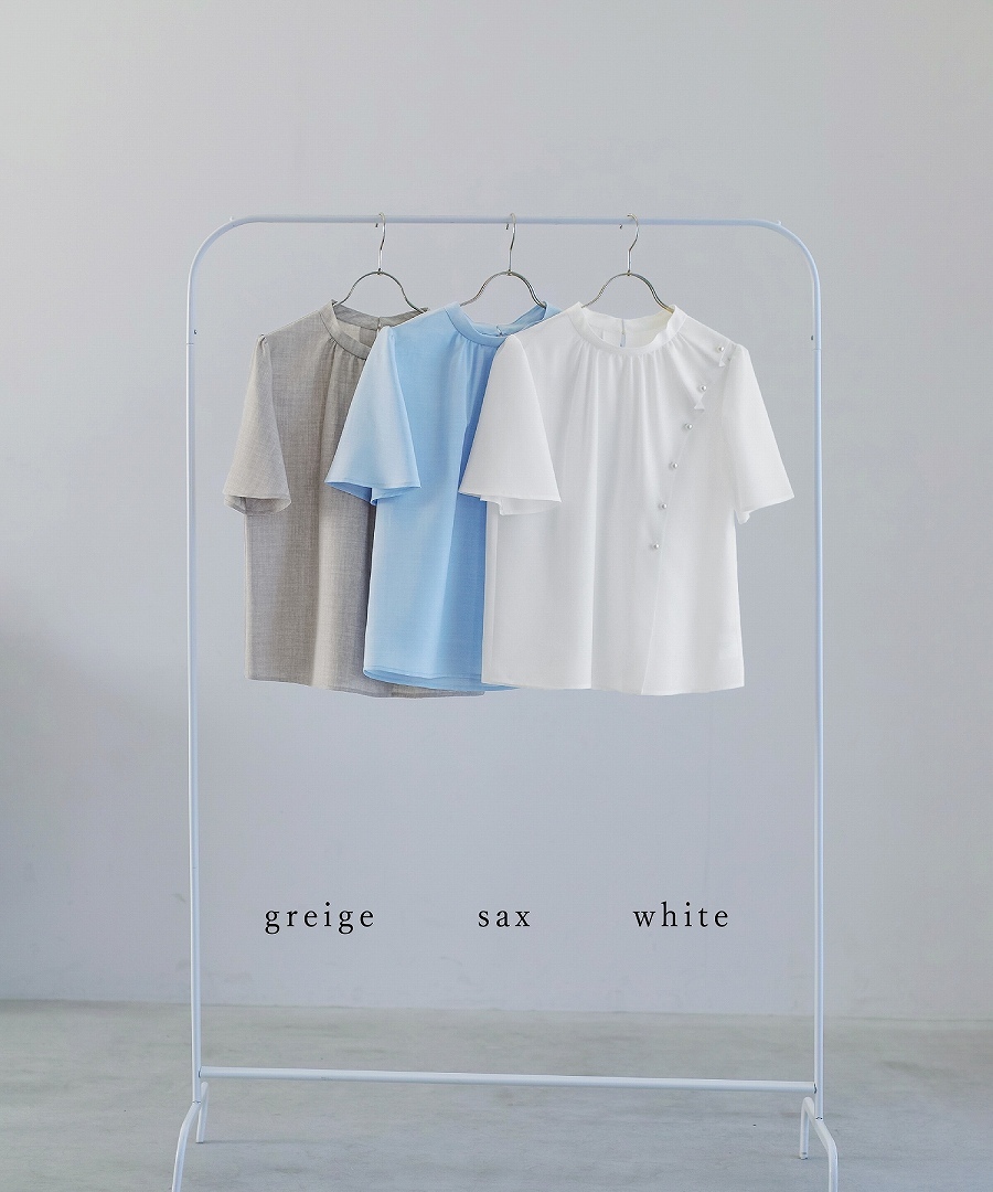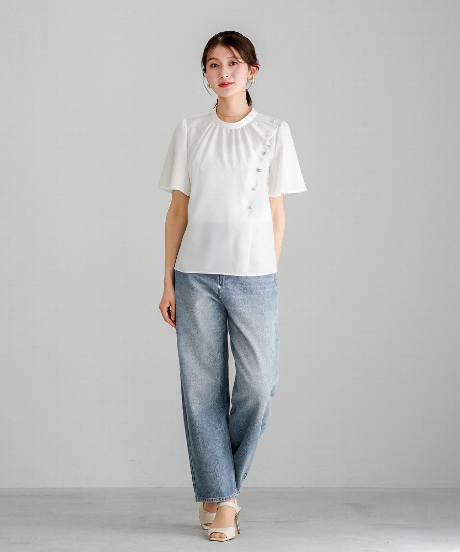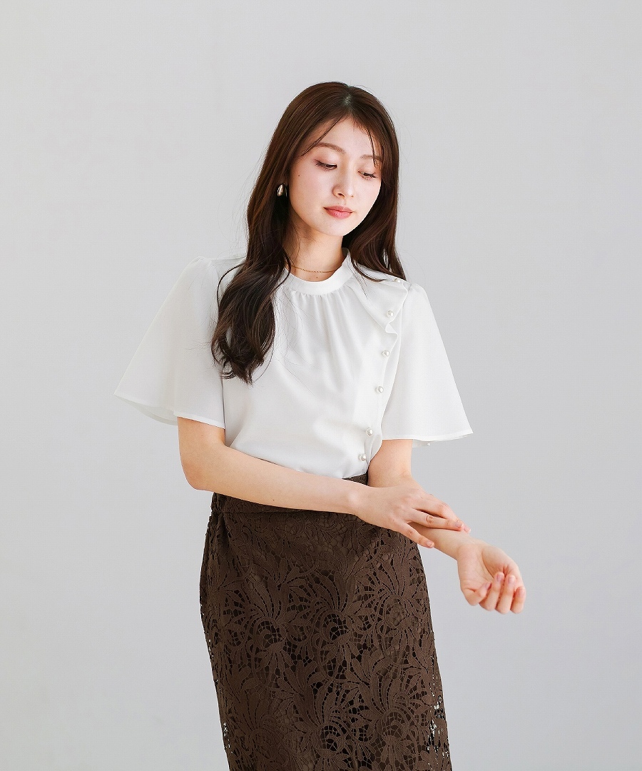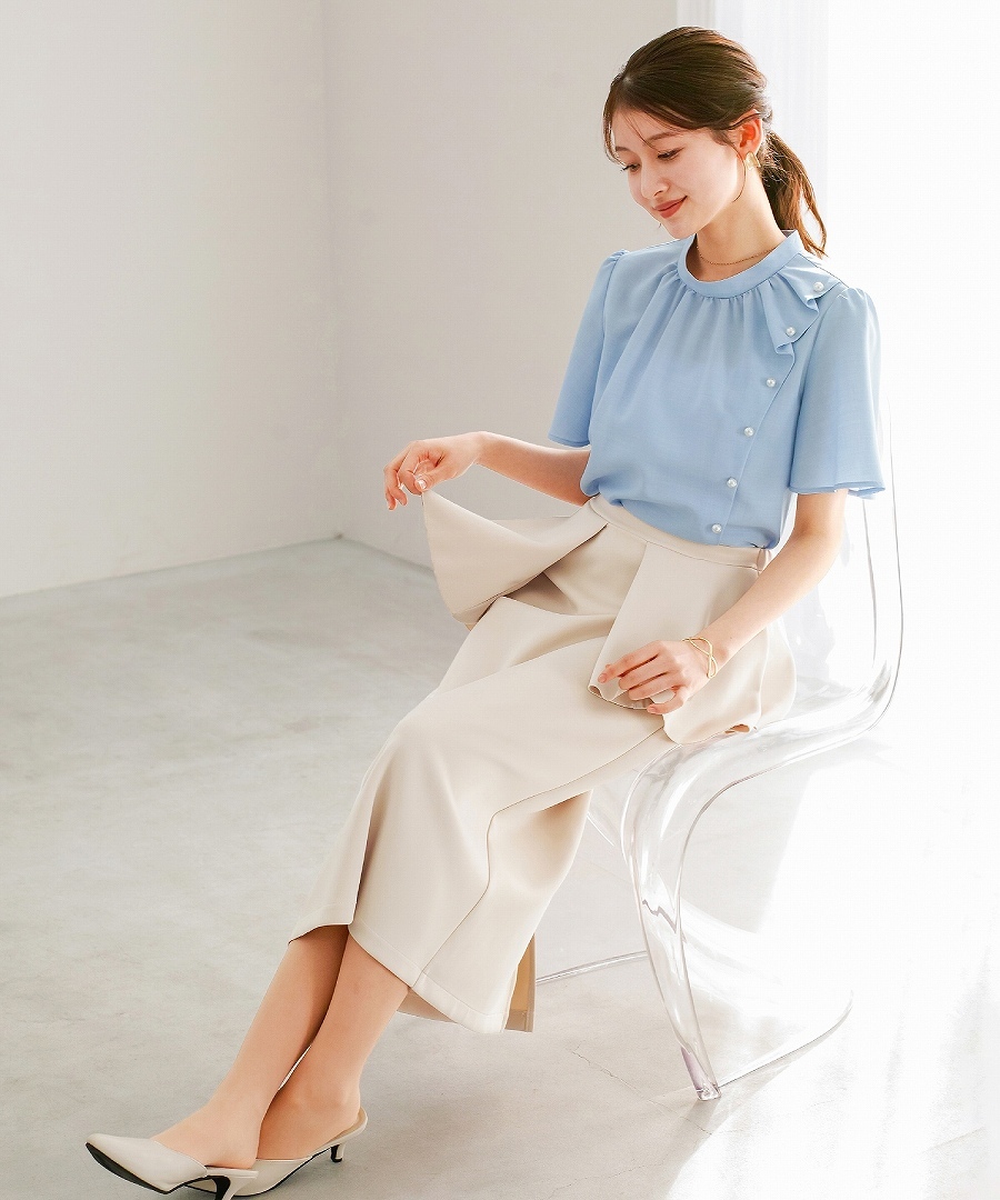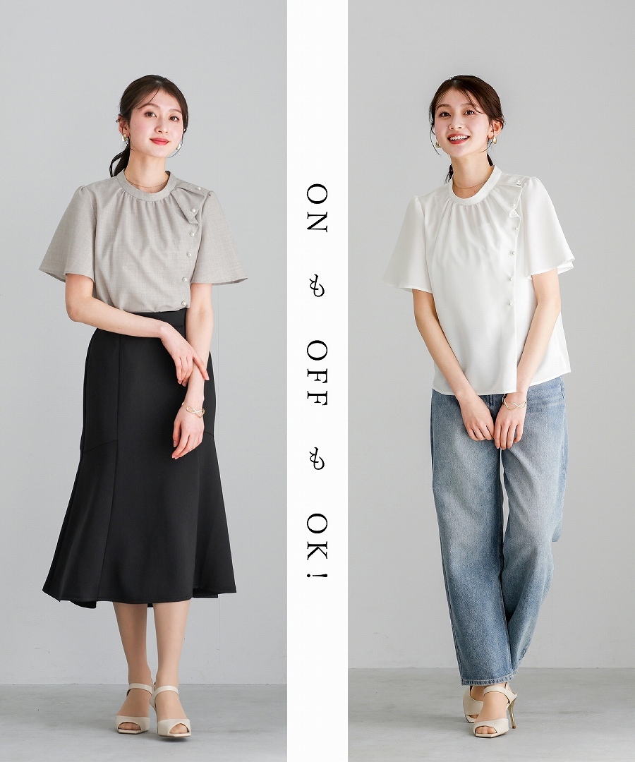 ブラウス 半袖ブラウス パールブラウス フリルブラウス きれいめブラウス オフィスコーデ 夏ブラウス レディーストップス 通勤コーデ 上品トップス