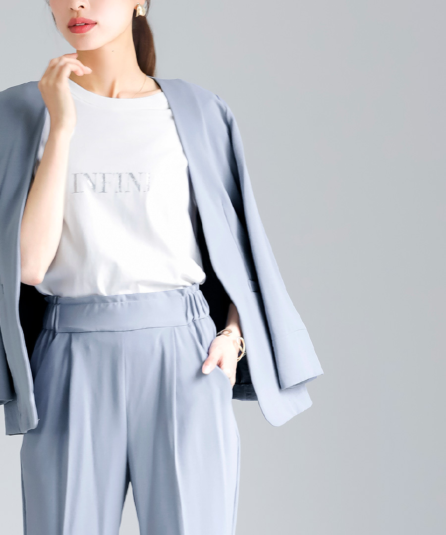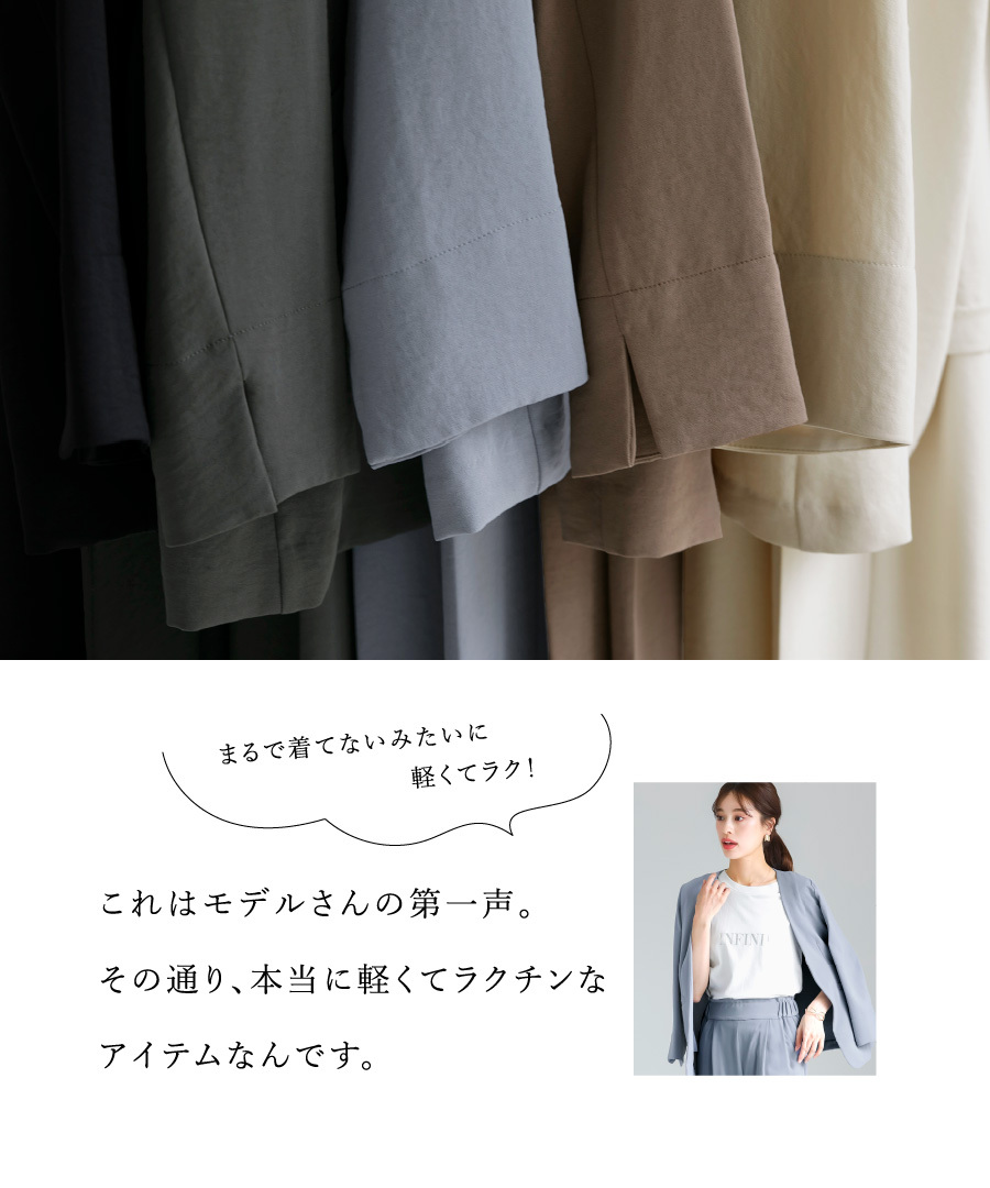ノーカラーデザインが涼し気なカラーレスジャケットと